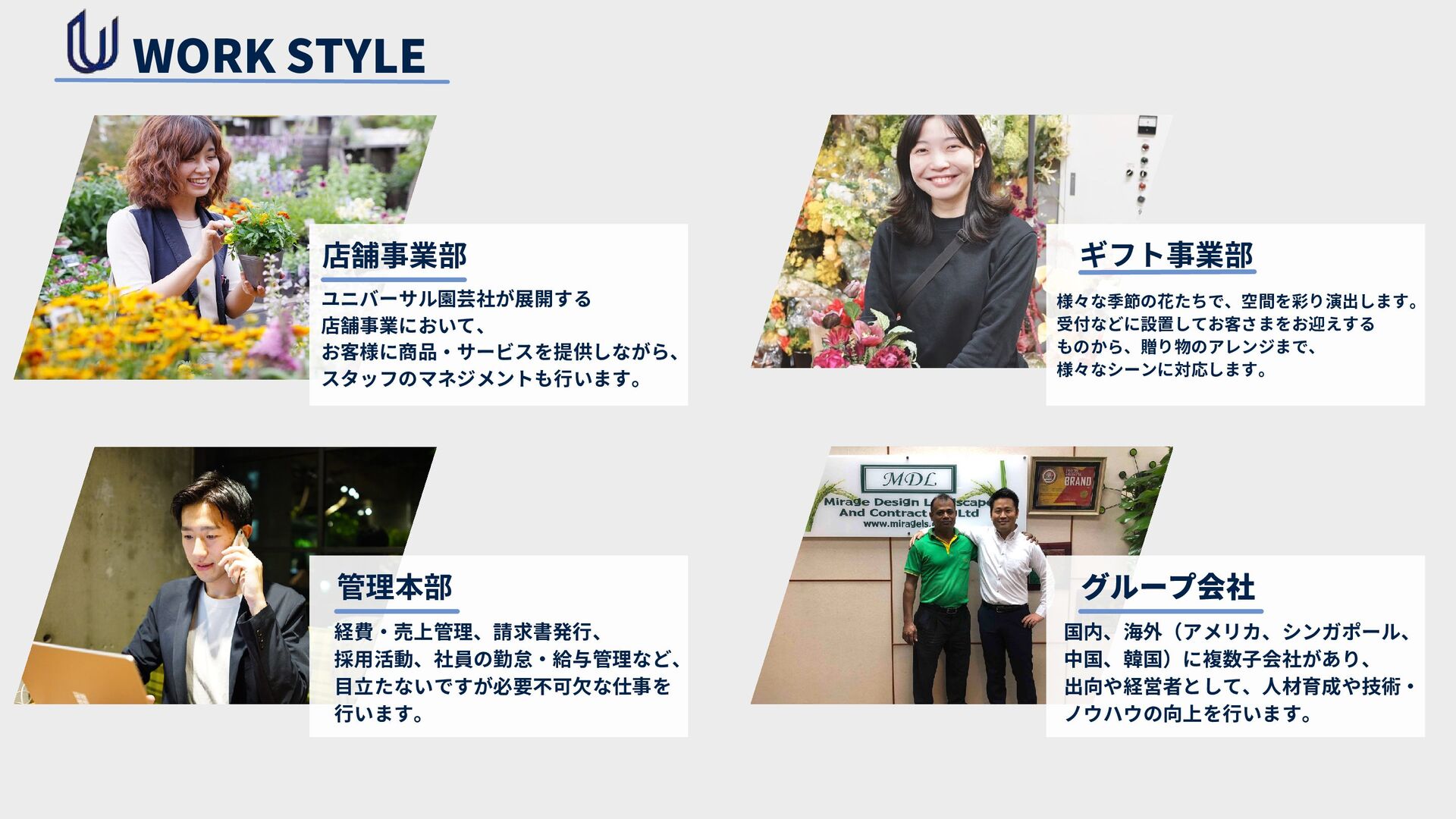 ユニバーサル園芸社が展開する 店舗事業において、 お客様に商品・サービスを提供しながら、 スタッフのマネジメントも行います。 WORK STYLE 様々な季節の花たちで、空間を彩り演出します。 受付などに設置してお客さまをお迎えする ものから、贈り物のアレンジまで、 様々なシーンに対応します。