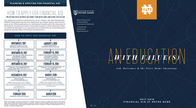 consideration for all sources of need-based assistance. Recognizing that every family’s situation is unique, the Office of Financial Aid is committed to a thorough and individual review of each application for financial assistance. Our review considers many factors including size of household, number in college, assets, and special circumstances. To give you a sense of how Notre Dame used its own resources to assist first-year students in the fall of 2016, the chart below reflects the number of students by parent income who received need-based scholarship. By providing the median (amount that falls in the middle) and the range we hope you are able to get an idea of the need-based scholarship commitment the University has made and how families with different resources are financing their cost. * Most who qualify have at least two children in college. The figures above include University scholarships, Federal Pell grant, and Federal Supplemental grants. For more information, please visit financialaid.nd.edu. PARENT INCOME RANGES UP TO $19,999 $20,000 - $39,999 $40,000 - $59,999 $60,000 - $79,999 $80,000 - $99,999 $100,000 - $119,999 $120,000 - $139,999 $140,000 - $159,999 $160,000 - $179,999 $180,000 - $199,999 $200,000 - $249,999 $250,000+ * TOTAL MEDIAN NEED-BASED SCHOLARSHIP $58,450 $54,000 $52,700 $49,300 $46,247 $42,750 $39,600 $34,300 $31,300 $27,100 $22,100 $15,200 $39,100 MIDDLE RANGE OF SCHOLARSHIPS $53,400 - $61,350 $50,000 - $56,200 $47,200 - $55,100 $43,100 - $54,400 $42,100 - $50,000 $38,000 - $46,600 $31,200 - $44,300 $28,600 - $40,000 $24,700 - $35,800 $19,050 - $35,350 $11,200 - $29,000 $8,300 - $25,000 $25,200 - $50,100 STUDENTS 39 85 94 77 82 98 80 79 89 56 118 106 1003 2016-2017 ACADEMIC YEAR TUITION: $49,685 + ROOM AND MEALS: $14,358 = $64,043 In addition to the direct cost, each student should plan for the cost of books, supplies, transportation, and personal expenses. Annual increases should be anticipated. Tuition and Fees Room and Meals Total Direct Cost: $51,505 $14,890 $66,395 100% Notre Dame commits to meet 100% of demonstrated financial need of our undergraduates 75% Nearly 75% of undergraduates receive some form of financial assistance $136 MILLION in need-based scholarship assistance for all undergraduates in the 2016-2017 academic year 75% of all undergraduates participate in internships 98% of all students return for their second year at Notre Dame 95% graduation rate, best 4 and 5 year rate among top private universities 98% of students are successful in finding career opportunities (career, service, or graduate school) after graduation 32% Early career salary is 32% higher compared to other 4-year institutions’ medians 250+ Broad alumni network (250+ clubs domestic and abroad) helping with career advancement, mentoring, and support $36 MILLION in University need-based aid for first-year class $39,100 in median need-based scholarship for first-year students (University, Federal Pell, and Supplemental grants) $3,800 average freshman need-based loan (no interest while enrolled at University) $23,250 average federal loan debt of graduates (May 2016 graduates) Financial need is the difference between the estimated cost of attendance for a school year and the estimated family responsibility (expected family contribution). Because several factors in the evaluation are subject to change from one year to the next, this evaluation is made annually for each student who applies for financial aid. Cost of Attendance – Family Responsibility Financial Need OPPORTUNITIES AND OUTCOMES FINANCIAL NEED AVERAGE DIRECT COST FOR 2017-2018 IMPORTANT FACTS ABOUT INVESTING IN A NOTRE DAME EDUCATION NEED-BASED AWARDS TO FIRST-YEAR STUDENTS 2017-2018