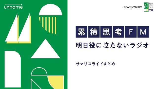 マーケティングカンパニー・株式会社unnnameがSpotifyで配信しているPodcast「累積思考FM~明日役に立たないラジオ~」のサマリスライドまとめです。累積思考FMでは「すぐに役に立つことよりも、思考を累積していくことに重点を置く」という方針のもと、社内の雑談を聞いているようなトークを配信しています。