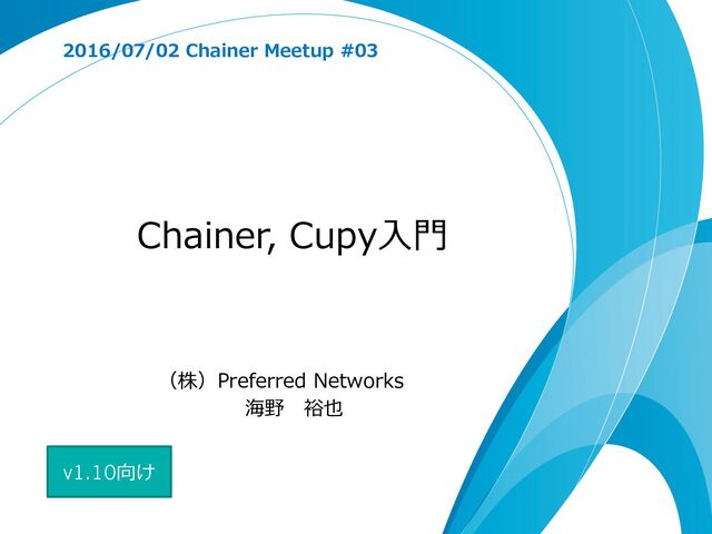 l data 属性に保存される l 多くの Function は配列の最初の軸をミニバッチとして 使うので注意 l 下の x は、20 次元ベクトルが 10 個⼊ったミニバッチとみなす l 現状、Chainer は多くの場所で float32 配列を要求する ので注意 17 x = Variable(np.zeros((10, 20), dtype=np.float32)) x.data