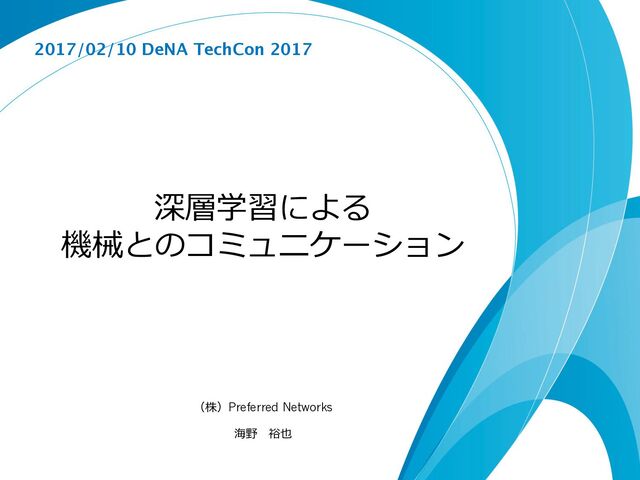⽇本アイ・ビー・エム(株)東京基礎研 l 2011-2016 (株)プリファードインフラストラク チャー l 2016- (株)プリファードネットワークス l ⾃然⾔語処理、機械学習、テキストマイニング l ChainerなどのOSS開発 l 対話処理など NLP若⼿の会共同委員⻑(2014-) 「オンライン機械学習」(2015, 講談社) 2