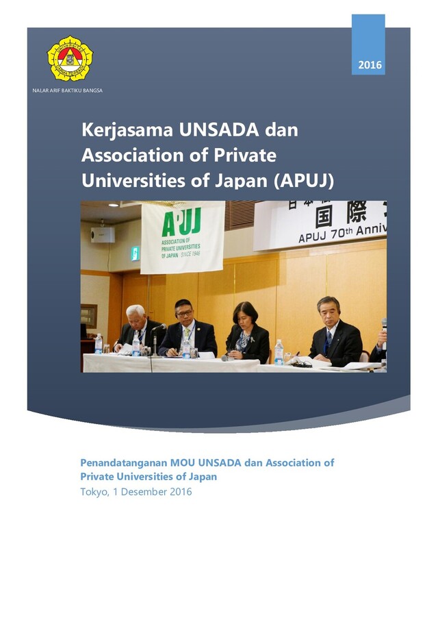 UNDERSTANDING BETWEEN Darma Persada University AND Association of Private Universities of Japan Darma Persada University, Indonesia and Association of Private Universities of Japan agree on the following program in order to foster the exchange and cooperation in higher education, research and other related fields. 1. The two parties will work towards carrying out activities to foster young students in both countries. 2. Based on the principles of respect for each other's independence and of mutual benefit, the two parties will work towards carrying out the following activities: (l) Exchange of scientific materials, publications and information (2) Joint conference and research meetings (3) Activities in areas of mutual interest 3. This memorandum of understanding is valid for a period of 4 (four) years from the date of signing. In the event of the need to extend this agreement, one party must inform the other in writing at least 3(three) months prior to termination. 4. Revisions to this agreement may be made upon the mutual consent of the two parties. 5. Each party will keep a copy of this agreement, both in English and in Japanese. In witness thereof, the undersigned had signed this agreement on behalf of their respective parties on the date shown with their respective signatures: Dadang Solihin President Darma Persada University r /r- J ^rl unao Onuma President Association of Private Universities of Japan Date: ',^'A t2 / Date: