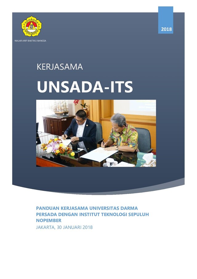 untuk FTK se Indonesia serta adanya hubungan baik antara para dosen ITS dan Unsada khusunya di FTK. TAHAPAN PELAKSANAAN KERJASAMA a. Tahap awal adalah pemikiran dan usulan dari beberapa dosen terkait kedekatan secara lembaga karena sudah beberapa kali ITS memvisitasi prodi TSP dan juga TP dalam rangka borang akreditasi prodi dan secara pribadi juga kebetulan adanya kedekatan antara kedua Rektor ITS dan Rektor Unsada karena dulunya teman sekolah sewaktu SMP dan SMA di Bandung. Usulan kerjasama dilanjutkan dengan pembicaraan awal dilakukan oleh perwakilan dosen bersama dengan Rektor Unsada. Rektor menyetujui dan mendukung penuh untuk segera direalisasikan, dengan syarat kuliah harus dilaksanakan di Unsada dan para peserta tidak meninggalkan tugas utamanya baik sebagai struktural maupun dosen di lingkungan Unsada. b. Tahap kedua adalah pada bulan-bulan antara Mei sampai Agustus 2017 sambil melaksanakan pengurusan borang dilakukan pembicaraan antar perguruan tinggi oleh kedua Rektor (keduanya sempat bertemu di Jakarta dalam pengukuhan Kapolri sebagai Guru Besar PTIK) dan disepakati sama-sama mendukung untuk dapat dilaksanakan secepatnya. Usulan ini dibantu juga oleh Wakil Dekan FTK yang kebetulan berkawan dekat dengan Wakil Rektor I ITS karena satu almamater sewaktu belajar di Jepang. Pada prinsipnya, para pejabat di lingkungan Rektorat ITS tidak keberatan namun pelaksanaan secara teknis berada di tingkat fakultas dan departemen (jurusan kalau di Unsada). c. Tahap ketiga pada tanggal 30 Agustus 2017 di akhir masa semester genap tahun akademik 2016/2017 diselengarakan lokakarya KKNI prodi TP dan TSP di FTK Unsada. Pada waktu itu datanglah Ketua Program Studi Teknik Sistem Perkapalan (Siskal) ITS Indra Ranu Kusuma, MT sebagai narasumber dari ITS. Dan pada kesempatan itu pula beliau menegaskan bahwa untuk program S3 di ITS kendali pelaksanaan berada di bawah Fakultas dan Jurusan / Departemen. Beliau menjanjikan akan membantu Unsada untuk membicarakan dengan jajaran di fakultas dan departemen Siskal di ITS. d. Tahap keempat pada tanggal 22 September 2017 Unsada dikunjungi oleh RO. Saut Gurning, Ph.D selaku ketua prodi Pasca Sarjana Fakultas Teknologi Kelautan ITS guna menjajaki penawaran kerjasama program S3 ITS – Unsada. Dari kunjungan itu, yang juga sempat diterima oleh Rektor Unsada diambil kesimpulan bahwa program S3 ITS – Unsada