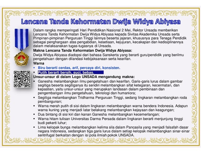Dalam rangka memperingati Hari Pendidikan Nasional 2 Mei, Rektor Unsada memberikan Lencana Tanda Kehormatan Dwija Widya Abiyasa kepada Sivitas Akademika Unsada serta Pimpinan-pimpinan Perguruan Tinggi lainnya beserta jajaran, khususnya para Tenaga Pendidik sebagai penghargaan atas pengabdian, kesetiaan, kejujuran, kecakapan dan kedisiplinannya dalam melaksanakan tugas-tugasnya di Unsada.