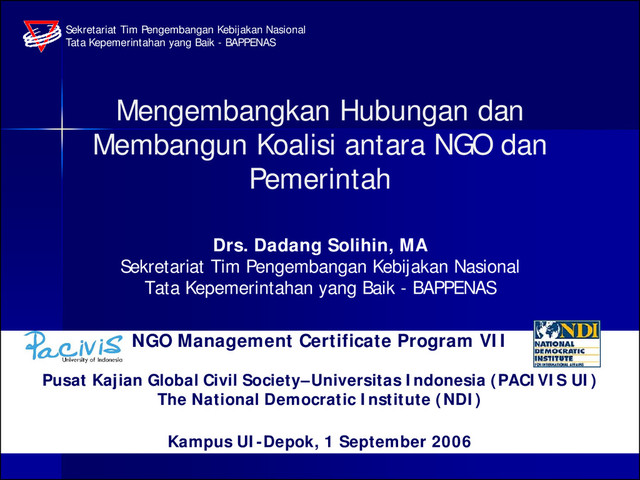 NGO Management Certificate Program VII Pusat Kajian Global Civil Society–Universitas Indonesia (PACIVIS UI) The National Democratic Institute (NDI) @ Kampus UI-Depok, 1 September 2006