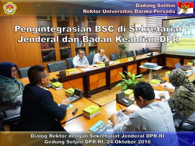 Growth Internal Business Process Customers Prespectives Stakeholders Prespectives Anggaran yang mencukupi Persidangan komisi dan paripurna Persidangan Badan-badan dan Mahkamah Kehormatan Dewan Peningkatan pemahaman pegawai Setjen DPR-RI Pengembangan organisasi yang andal dan modern Sistem informasi Sekretariat Jenderal DPR-RI yang handal Fasilitasi kerja sama antarparlemen “Terwujudnya Sekretariat Jenderal DPR RI yang profesional, andal, transparan, dan akuntabel dalam mendukung fungsi DPR RI” Terfasilitasinya persidangan Komisi- komisi, Paripurna, dst Tersedianya dukungan teknis dan administrasi, serta sarana dan prasarana yang memadai • Masyarakat • Pemda • K/L • SDM • Organisasi • TIK • Perumusan Kebijakan • Pelayanan • Pengelolaan • Pengembangan • Pengawasan