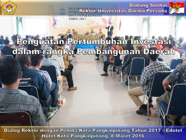 Pangkalpinang Tahun 2017 di Edotel Hotel-Kota Pangkalpinang, 8 Maret 2016 • Pada hari Selasa, 8 Maret 2016 di Hotel Edotel Kota Pangkalpinang Provinsi Bangka Belitung telah diadakan Musrenbang RKPD Kota Pangkalpinang Tahun 2017. • Hadir nara sumber dari Jakarta, yaitu Dr. Dadang Solihin, SE, MA, Rektor Universitas Darma Persada yang juga mantan Direktur Evaluasi Kinerja Pembangunan Daerah, Bappenas RI. • Menurut Dadang, investasi merupakan salah satu komponen penting dalam pembangunan ekonomi karena mempunyai keterkaitan dengan keberlangsungan kegiatan ekonomi di masa yang akan datang. Makin banyak dan tinggi nilai investasi, kian besar pula dampak dan manfaat yang dipetik, seperti menyerap tenaga kerja, optimalisasi sumber daya alam, serta yang paling utama meningkatkan kesejahteraan seluruh rakyat di daerah tersebut. • Dadang menambahkan bahwa selama lima tahun ke depan, penguatan investasi akan ditempuh oleh pemerintah berdasarkan Rencana Pembangunan Jangka Menengah (RPJMN) melalui dua pilar kebijakan yaitu peningkatan Iklim Investasi dan dan Iklim Usaha untuk meningkatkan efisiensi proses perijinan bisnis; dan peningkatan Investasi yang inklusif terutama dari investor domestik. Kedua pilar kebijakan ini akan dilakukan secara terintegrasi baik di tingkat pusat maupun daerah. • Pada pilar pertama, arah kebijakan yang ditempuh adalah menciptakan iklim investasi dan iklim usaha yang lebih berdaya saing, baik di tingkat pusat maupun daerah, yang dapat meningkatkan efisiensi proses perijinan, meningkatkan kepastian berinvestasi dan berusaha di indonesia, serta mendorong persaingan usaha yang lebih sehat dan berkeadilan. • Adapun pada pilar kedua, arah kebijakan yang ditempuh adalah mengembangkan dan memperkuat investasi di sektor riil, terutama yang berasal dari sumber investasi domestik, yang dapat mendorong pengembangan investasi dan usaha di Indonesia secara inklusif dan berkeadilan terutama pada sektor produktif yang mengutamakan sumber daya lokal. • Dalam bagian lain Dadang menjelaskan strategi peningkatan investasi daerah, yaitu pertama deregulasi (debottlenecking) peraturan-peraturan yang menghambat pengembangan investasi dan usaha di kawasan pertumbuhan ekonomi, dan kedua peningkatan iklim investasi dan iklim usaha di kawasan strategis. Juga disarankan pula kepada daerah untuk menerbitkan Perda yang kondusif terhadap iklim usaha dan investasi. dadang-solihin.blogspot.co.id 48