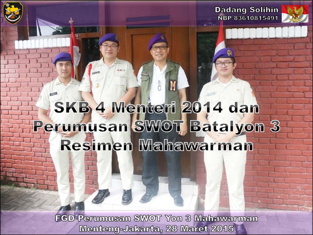 dan Tujuan Strategis • Mengapa ada SKB 4 Menteri? – Keikutsertaan Warga Negara dalam Pertahanan Negara – Menwa sebagai Komponen Bangsa yang Potensial dan Terdidik – Kegiatan Ekstrakurikuler melalui Menwa – Pembangunan SDM Pemuda melalui Menwa • Ruang Lingkup dan Strategi Pelaksanaan • SWOT Batalyon 3 • Grand Design Pembinaan Menwa 4 dadang-solihin.blogspot.com