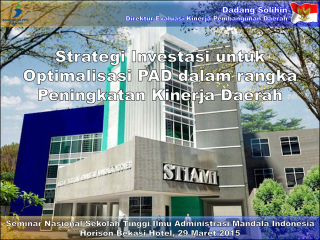 mempunyai keterkaitan dengan keberlangsungan kegiatan ekonomi di masa yang akan datang. Dengan melakukan investasi, kapasitas produksi dapat ditingkatkan, yang berarti peningkatan output. Peningkatan output akan meningkatkan pendapatan. Dalam jangka panjang akumulasi investasi mendorong perkembangan berbagai aktivitas ekonomi sehingga meningkatkan pertumbuhan ekonomi suatu wilayah. Dengan demikian dampak dan keterkaitannya cukup besar, baik pada investor sendiri, pemerintah daerah, maupun rakyat kecil. Makin banyak dan tinggi nilai investasi, kian besar pula dampak dan manfaat yang dipetik, seperti menyerap tenaga kerja, optimalisasi sumber daya alam, serta yang paling utama meningkatkan kesejahteraan seluruh rakyat di daerah tersebut. INVESTASI dadang-solihin.blogspot.com 8 Sumber: KPPOD 2015