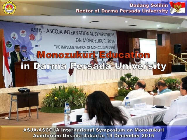 means of the assistance from education institutions from Japan, hence, the curriculum system is improved effectively by involving Monozukuri principles. The curriculum system is improved not only by considering the local interest, but also requirements of industry sectors, particularly manufacturing industries. Furthermore, at the very first stage of the improvement of curriculum system, it is also projected to Departments of Industrial Engineering and Mechanical Engineering. In 2016, the learning in Departments of Industrial Engineering and Mechanical Engineering is aimed to be performed with a new curriculum system with Monozukuri basis. dadang-solihin.blogspot.co.id 14