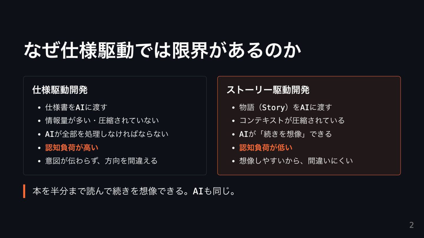 仕様書をAIに渡しても伝わらない。情報量が多く、AIが全部処理しなければならないから認知負荷が高い。