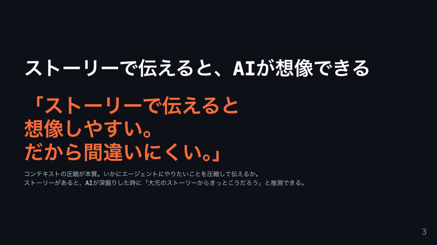 物語(Story)を渡すと、AIがコンテキストを圧縮・想像できるから間違いにくい。