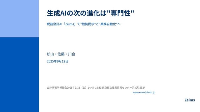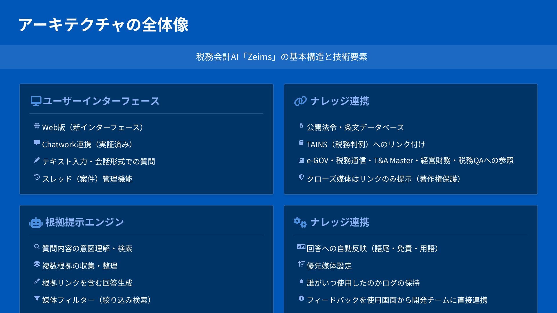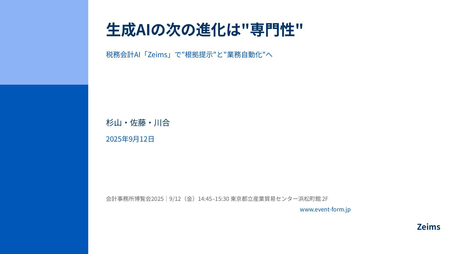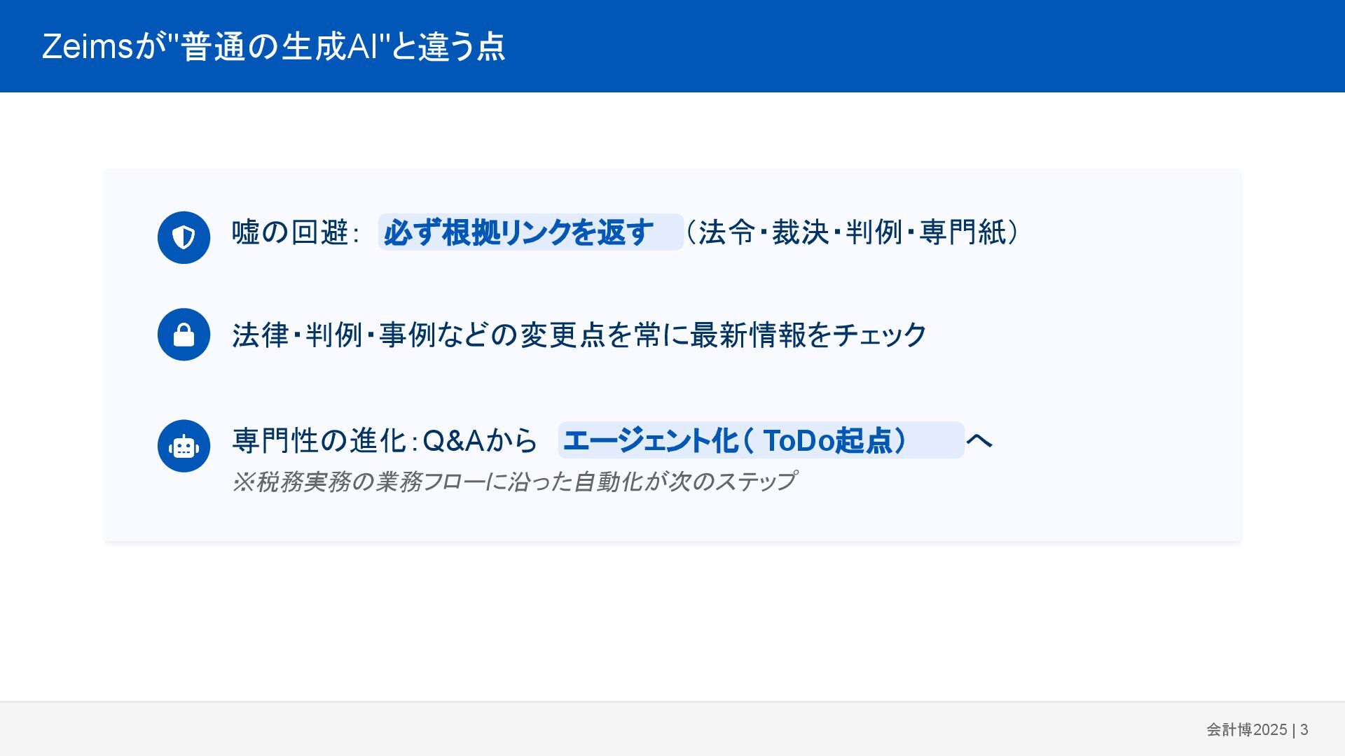 税務会計AI「Zeims」は、一般的な生成AIが抱える「それらしい嘘」の問題を解決し、プロの現場で活用できることを目指した専門ツールです 。
