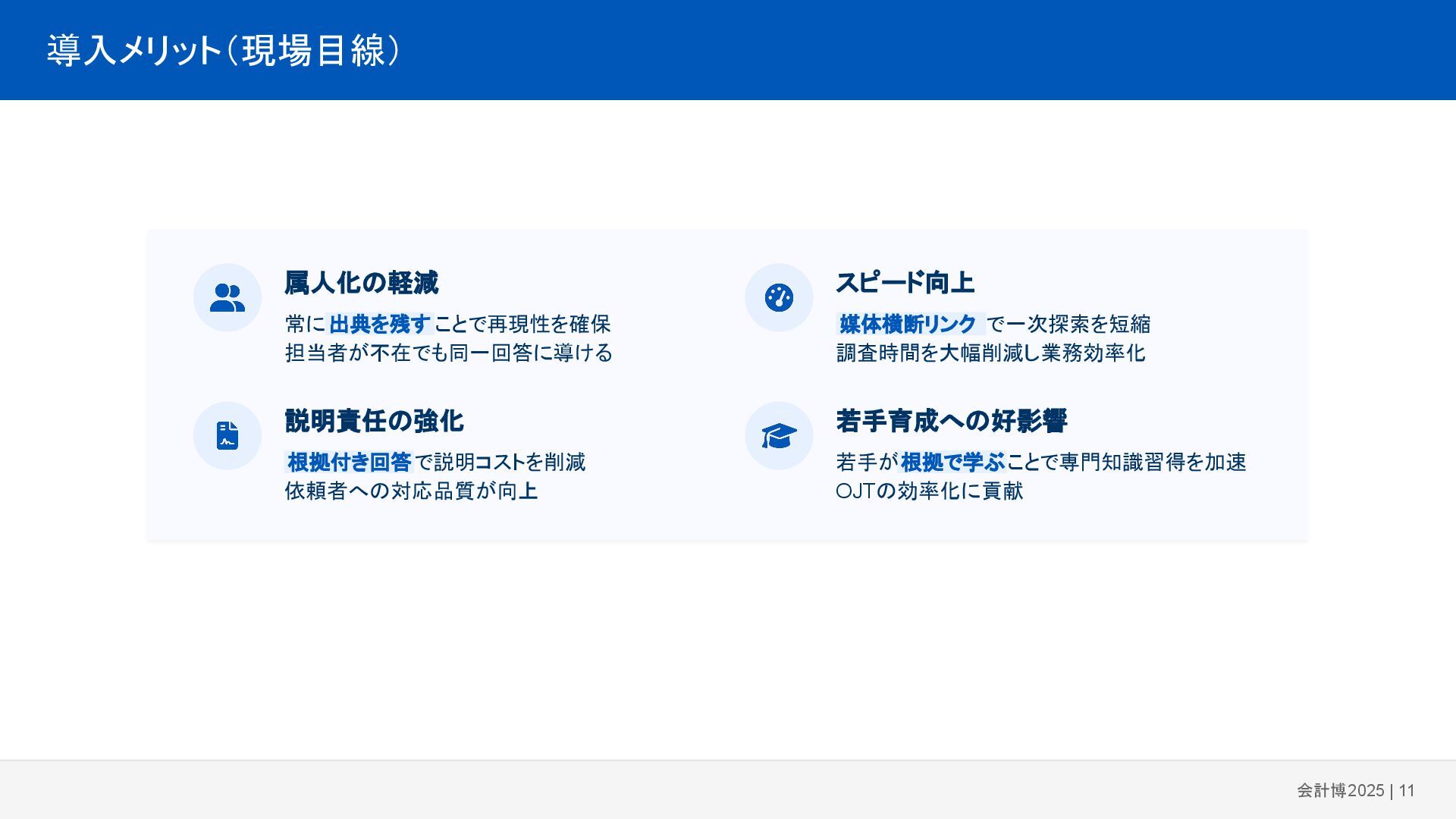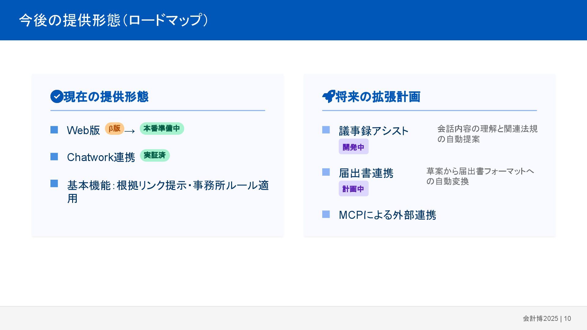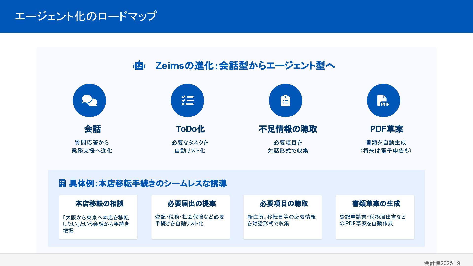 将来的には単なるQ&Aに留まらず、相談内容からToDoを洗い出し、書類の草案まで自動生成する「業務エージェント」へと進化します 。