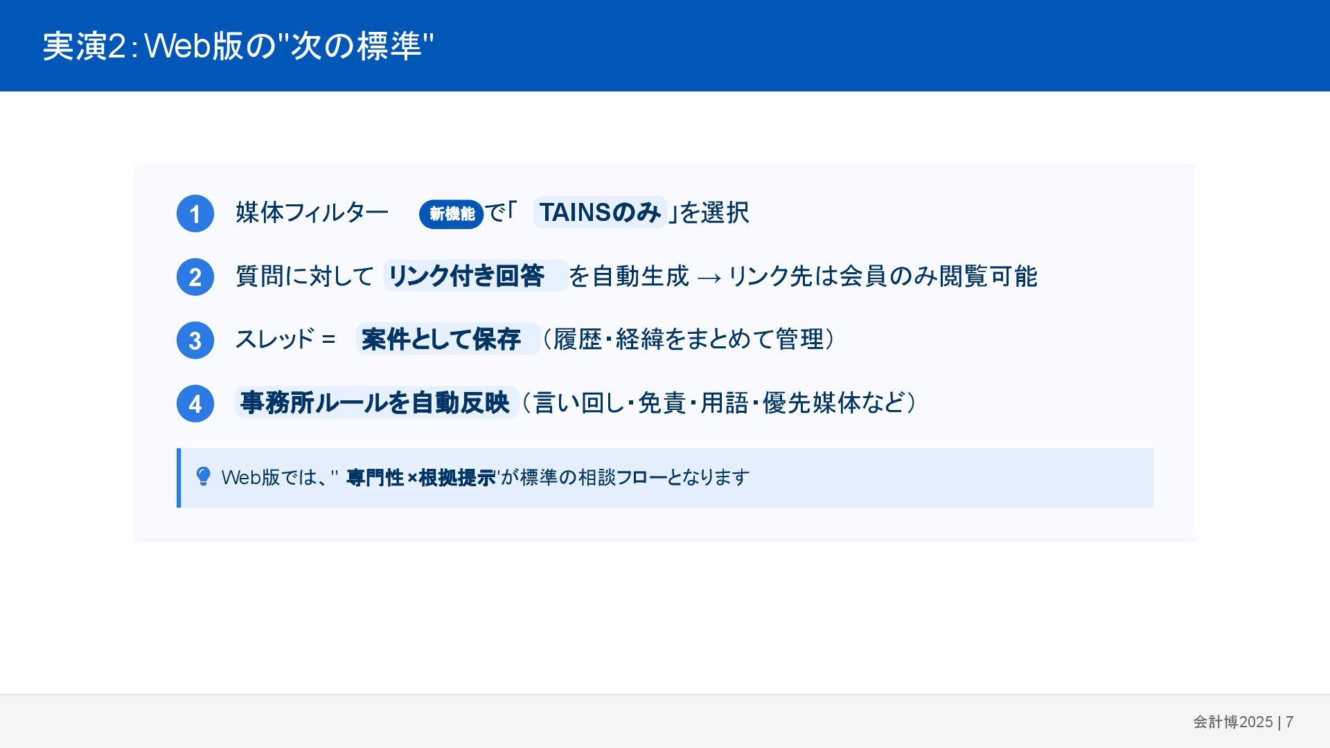 最大の特徴は、全ての回答に法令や判例といった「根拠リンク」を必ず提示し、専門家が最も重視する説明責任を果たせる点にあります 。