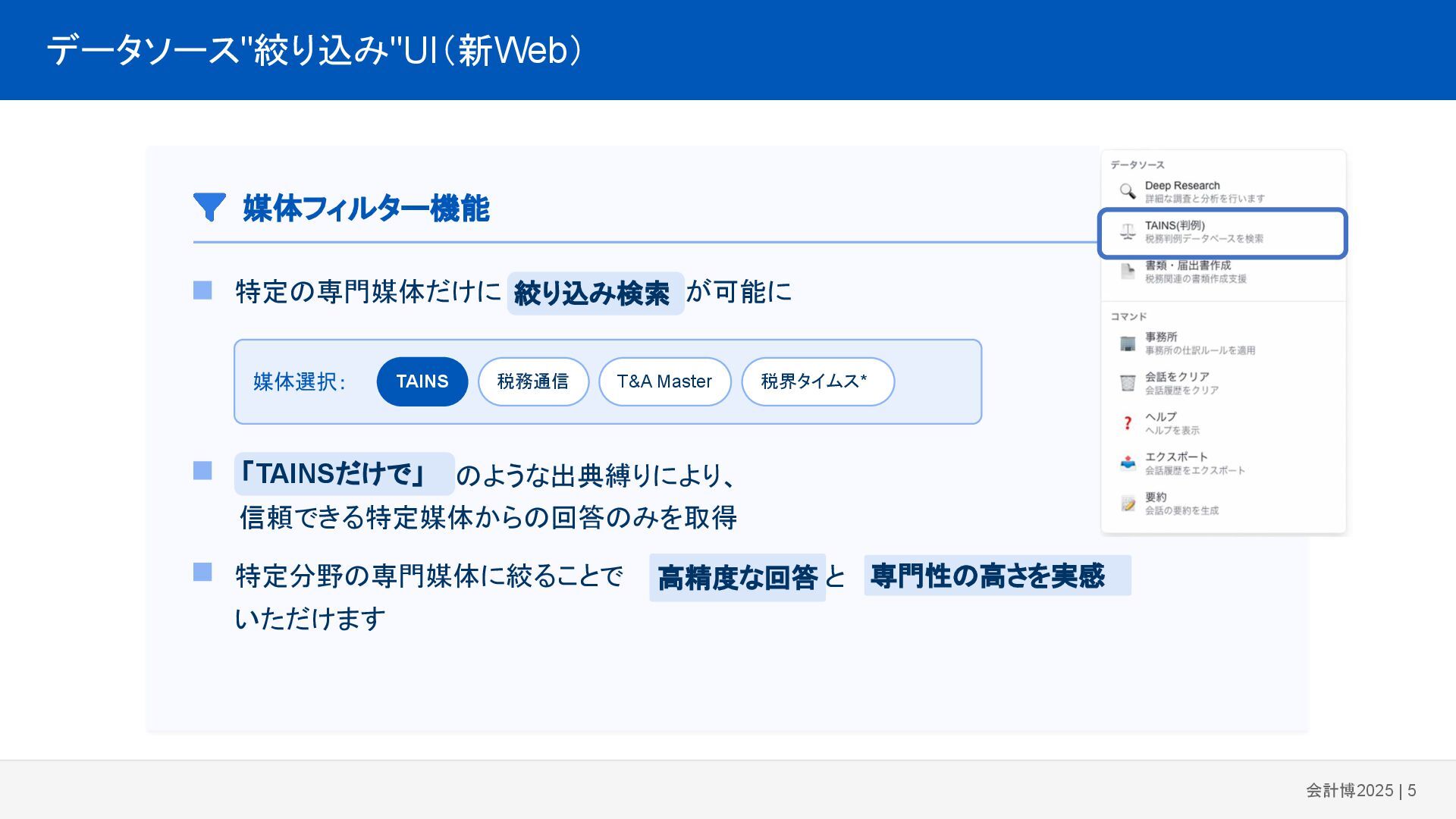 また「TAINSだけで調べて」といった、専門家ならではの要求に応える媒体フィルター機能も、強力な武器となります 。