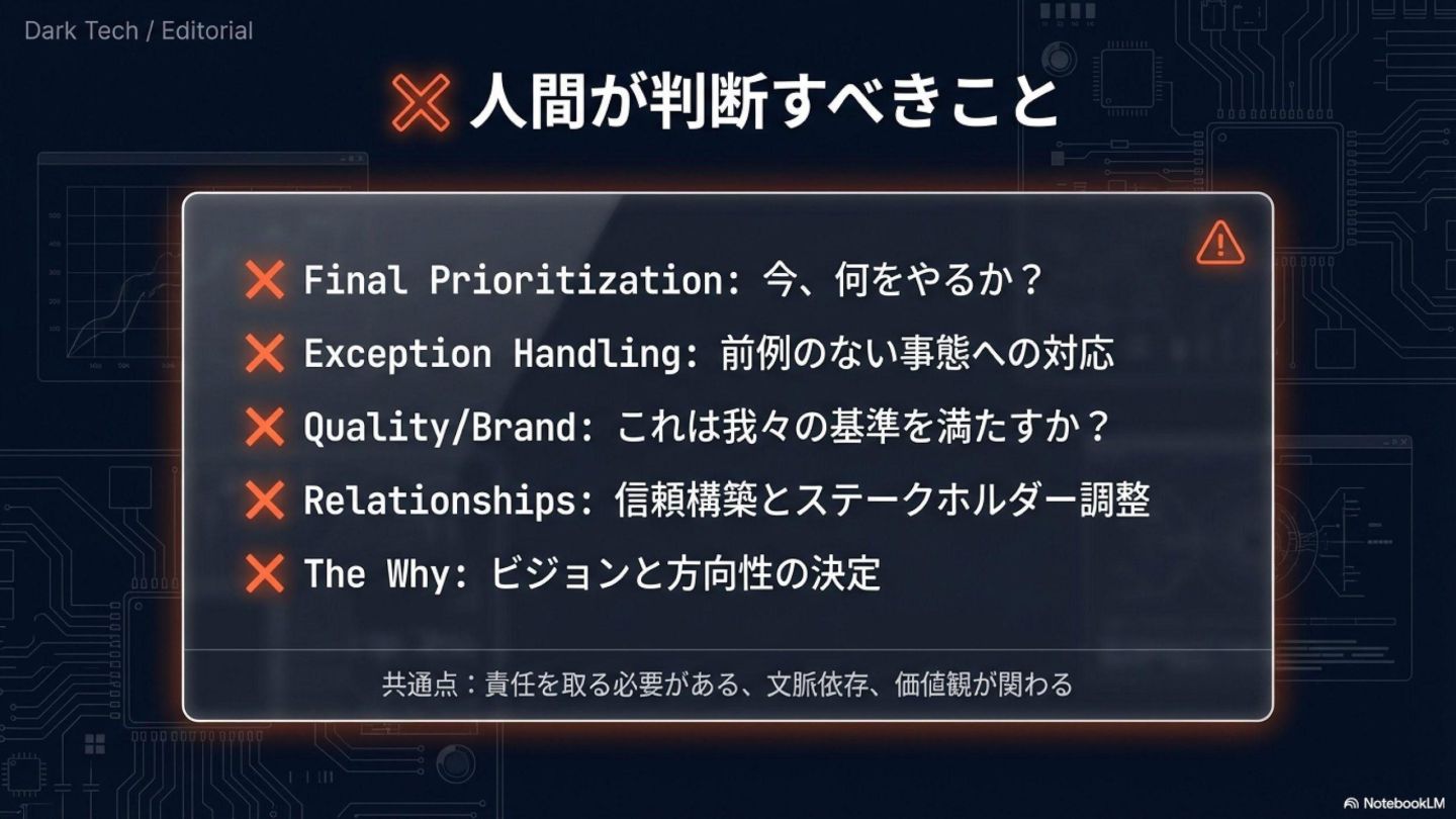 3. **人間は「方向を決める」**: 優先順位 / 例外判断 / 責任