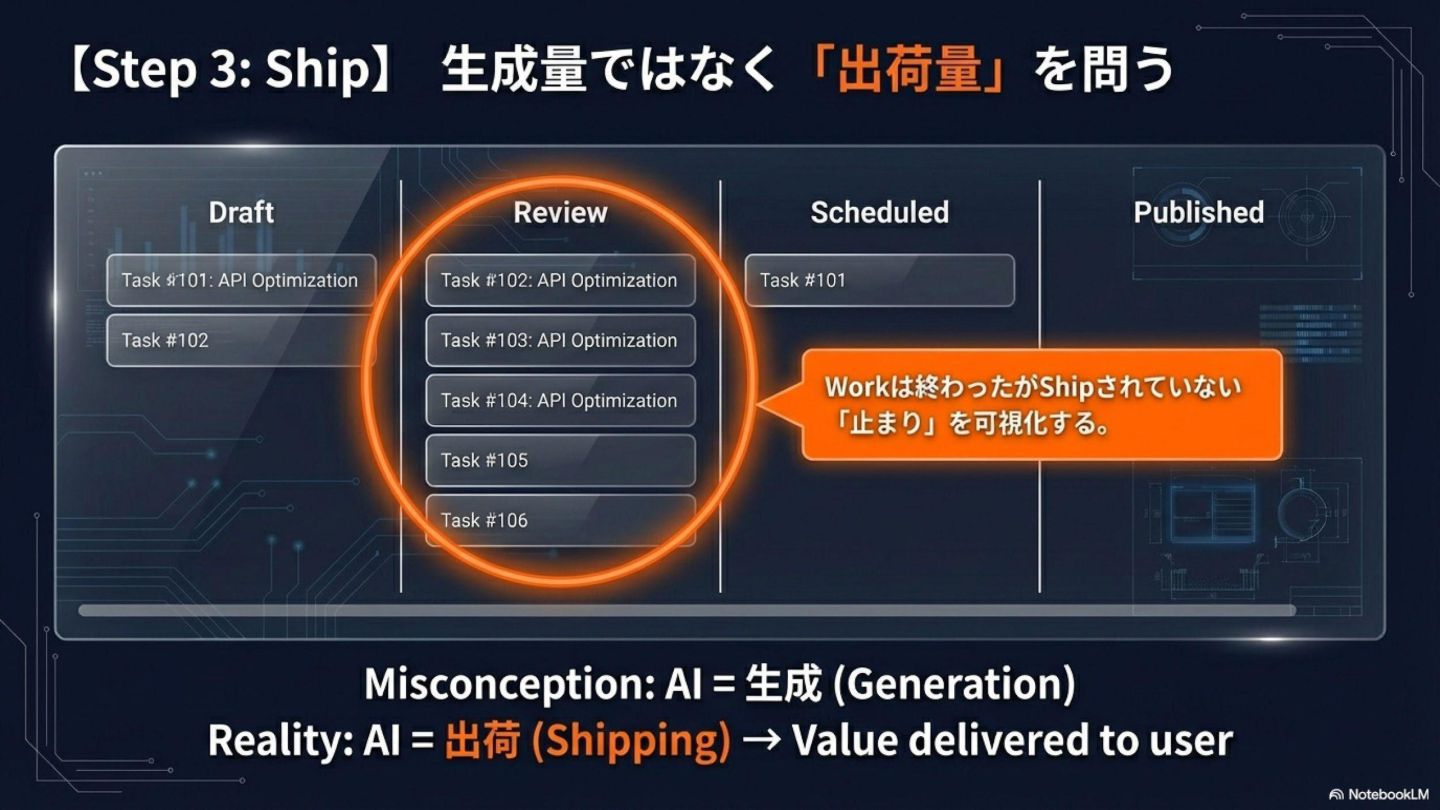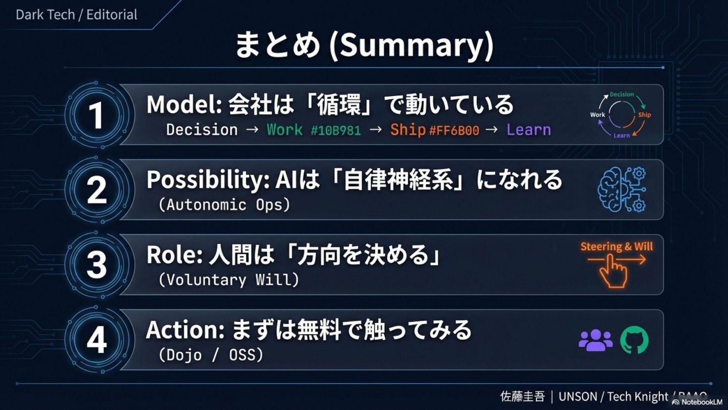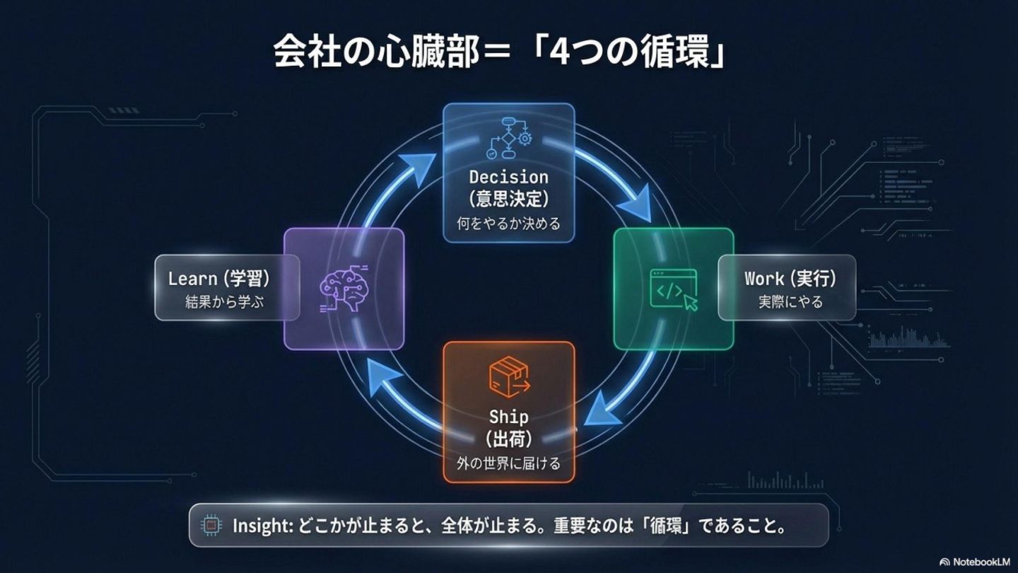 1. **会社は「循環」で動いている**: Decision → Work → Ship → Learn
