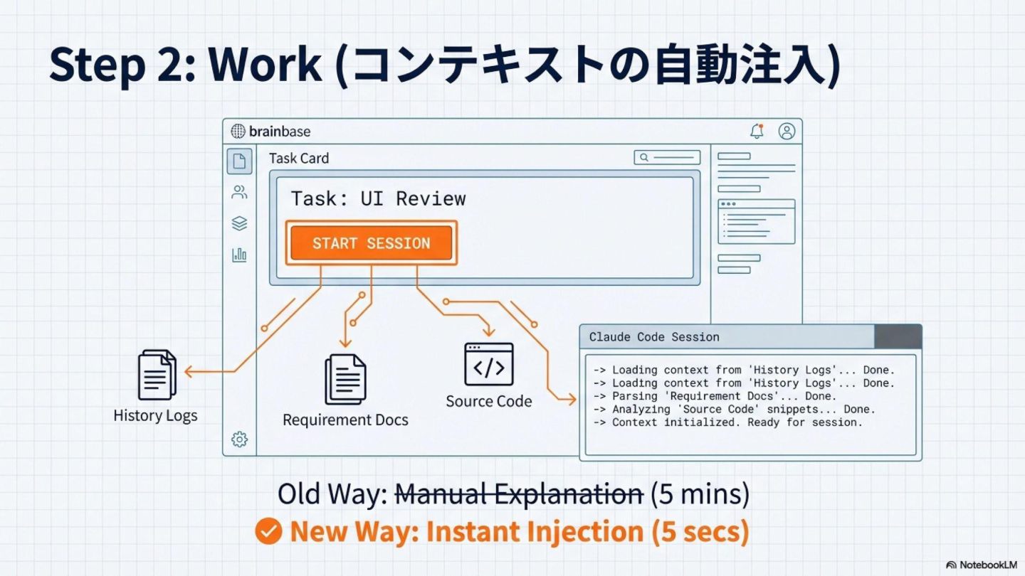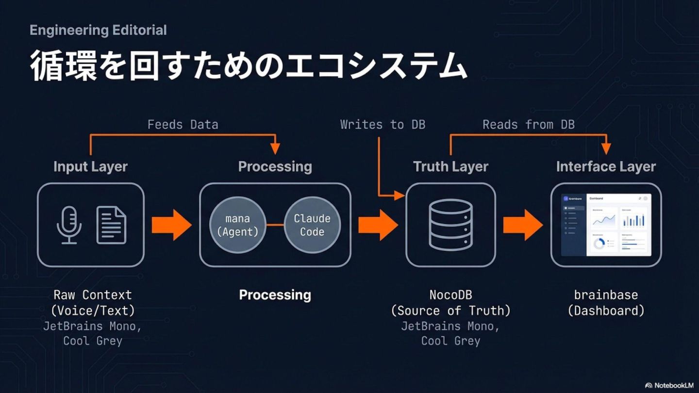 4. **実践ツール**: brainbase(循環OS)+ mana(Slack AI PM)+ Claude Code