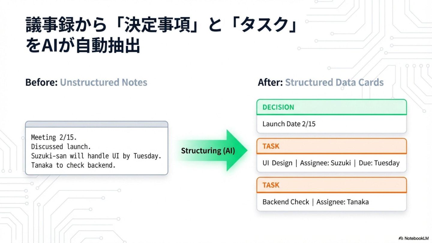 - 構造化(議事録→決定事項/タスク抽出)