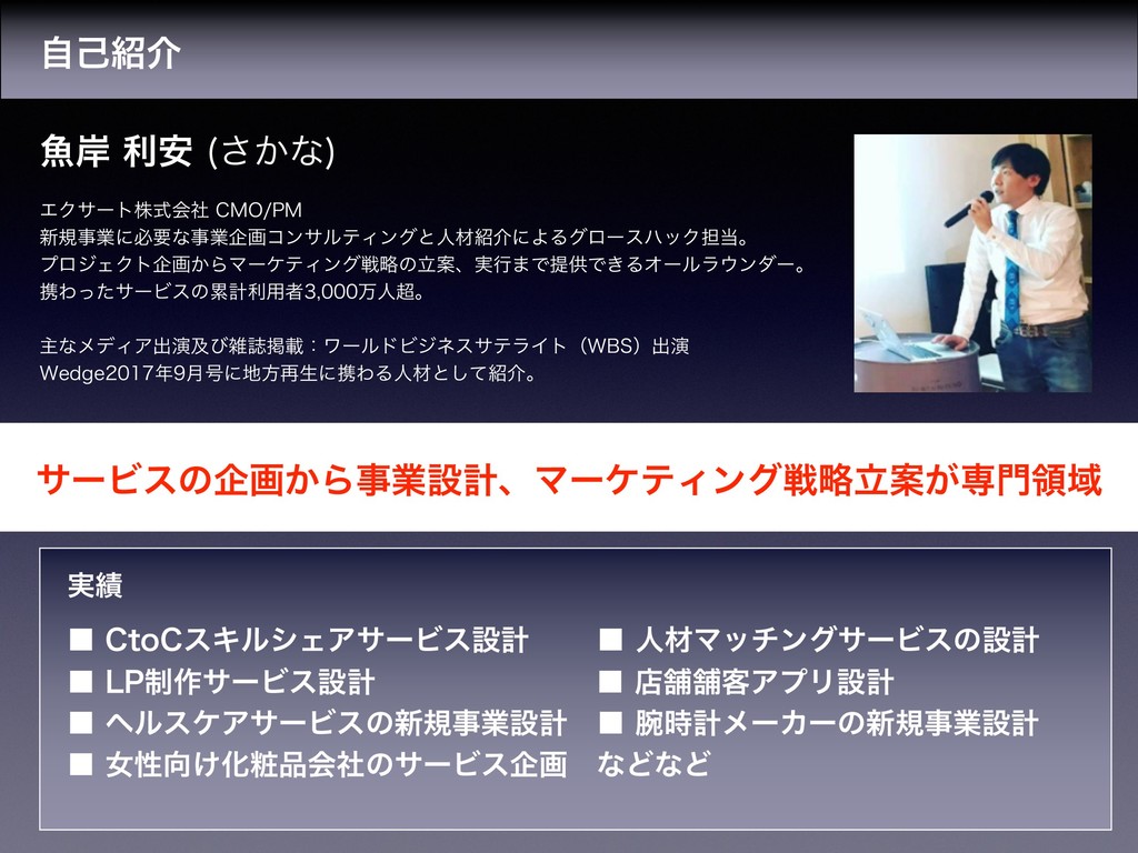 ˙ ࣌ܭϝʔΧʔͷ৽نࣄۀઃܭ ˙ ঁੑ͚ԽহձࣾͷαʔϏεاը ͳͲͳͲ αʔϏεͷاը͔ΒࣄۀઃܭɺϚʔέςΟϯάઓཱུҊ͕ઐྖҬ ΤΫαʔτגࣜձࣾ $.01. ৽نࣄۀʹඞཁͳࣄۀاըίϯαϧςΟϯάͱਓࡐհʹΑΔάϩʔεϋοΫ୲ɻ ϓϩδΣΫτاը͔ΒϚʔέςΟϯάઓུͷཱҊɺ࣮ߦ·ͰఏڙͰ͖ΔΦʔϧϥϯμʔɻ ܞΘͬͨαʔϏεͷྦྷܭར༻ऀ ສਓɻ ओͳϝσΟΞग़ԋٴͼࡶࢽܝࡌɿϫʔϧυϏδωεαςϥΠτʢ8#4ʣग़ԋ 8FEHF݄߸ʹํ࠶ੜʹܞΘΔਓࡐͱͯ͠հɻ ࣗݾհ ڕ؛ ར҆ ͔͞ͳ ࣮