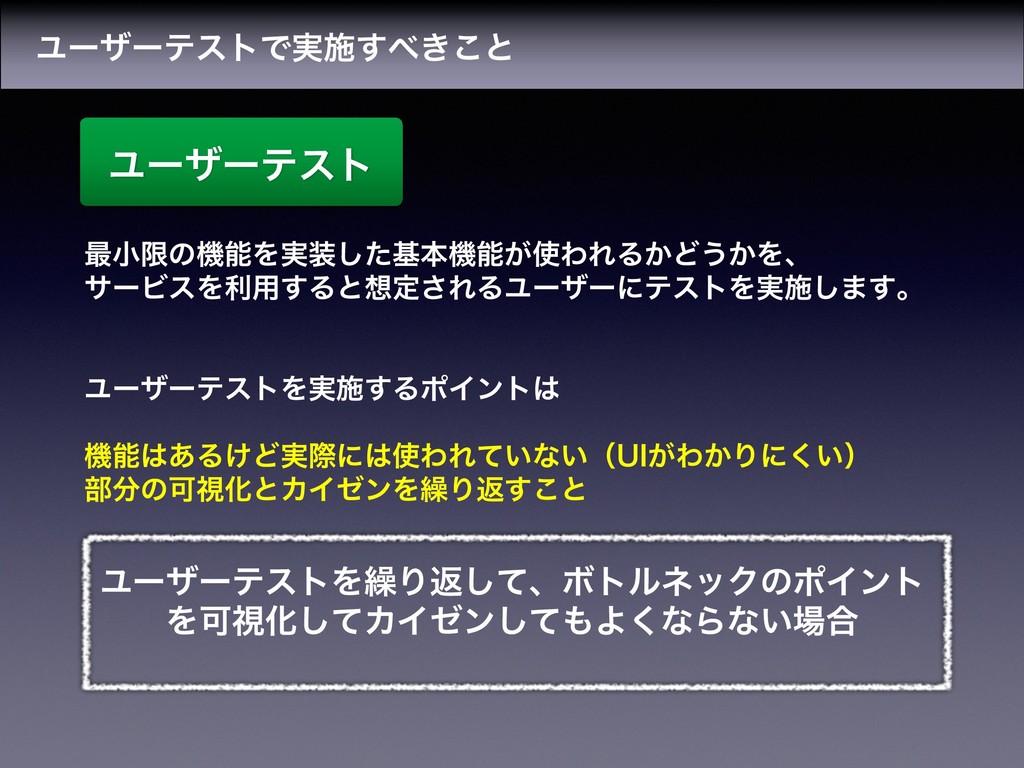 ϢʔβʔςετͰ࣮ࢪ͖͢͜ͱ Ϣʔβʔςετ ࠷খݶͷػೳΛ࣮ͨ͠جຊػೳ͕ΘΕΔ͔Ͳ͏͔Λɺ αʔϏεΛར༻͢Δͱఆ͞ΕΔϢʔβʔʹςετΛ࣮ࢪ͠·͢ɻ ϢʔβʔςετΛ࣮ࢪ͢ΔϙΠϯτ ػೳ͋Δ͚Ͳ࣮ࡍʹΘΕ͍ͯͳ͍ʢ6*͕Θ͔Γʹ͍͘ʣ ෦ͷՄࢹԽͱΧΠθϯΛ܁Γฦ͢͜ͱ ϢʔβʔςετΛ܁Γฦͯ͠ɺϘτϧωοΫͷϙΠϯτ ΛՄࢹԽͯ͠ΧΠθϯͯ͠Α͘ͳΒͳ͍߹