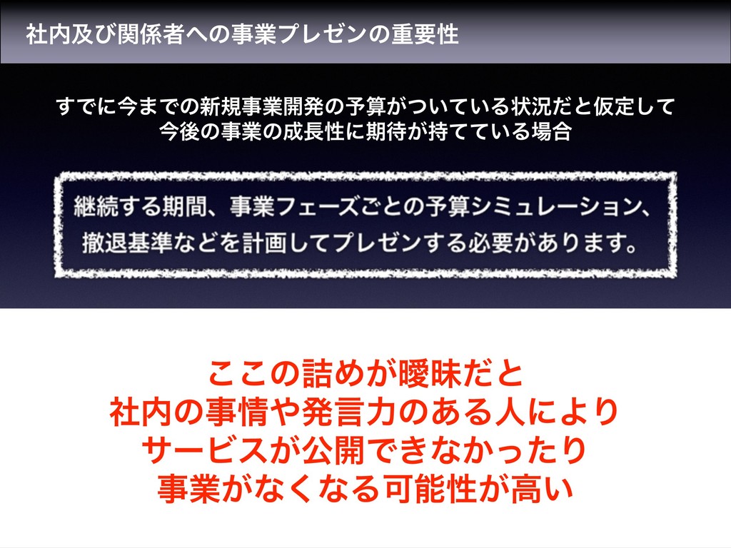 ͜͜ͷ٧Ί͕ᐆດͩͱ ࣾͷࣄൃݴྗͷ͋ΔਓʹΑΓ αʔϏε͕ެ։Ͱ͖ͳ͔ͬͨΓ ࣄۀ͕ͳ͘ͳΔՄೳੑ͕ߴ͍ ͢Ͱʹࠓ·Ͱͷ৽نࣄۀ։ൃͷ༧ࢉ͕͍͍ͭͯΔঢ়گͩͱԾఆͯ͠ ࠓޙͷࣄۀͷੑʹظ͕͍࣋ͯͯΔ߹ ࣾٴͼؔऀͷࣄۀϓϨθϯͷॏཁੑ