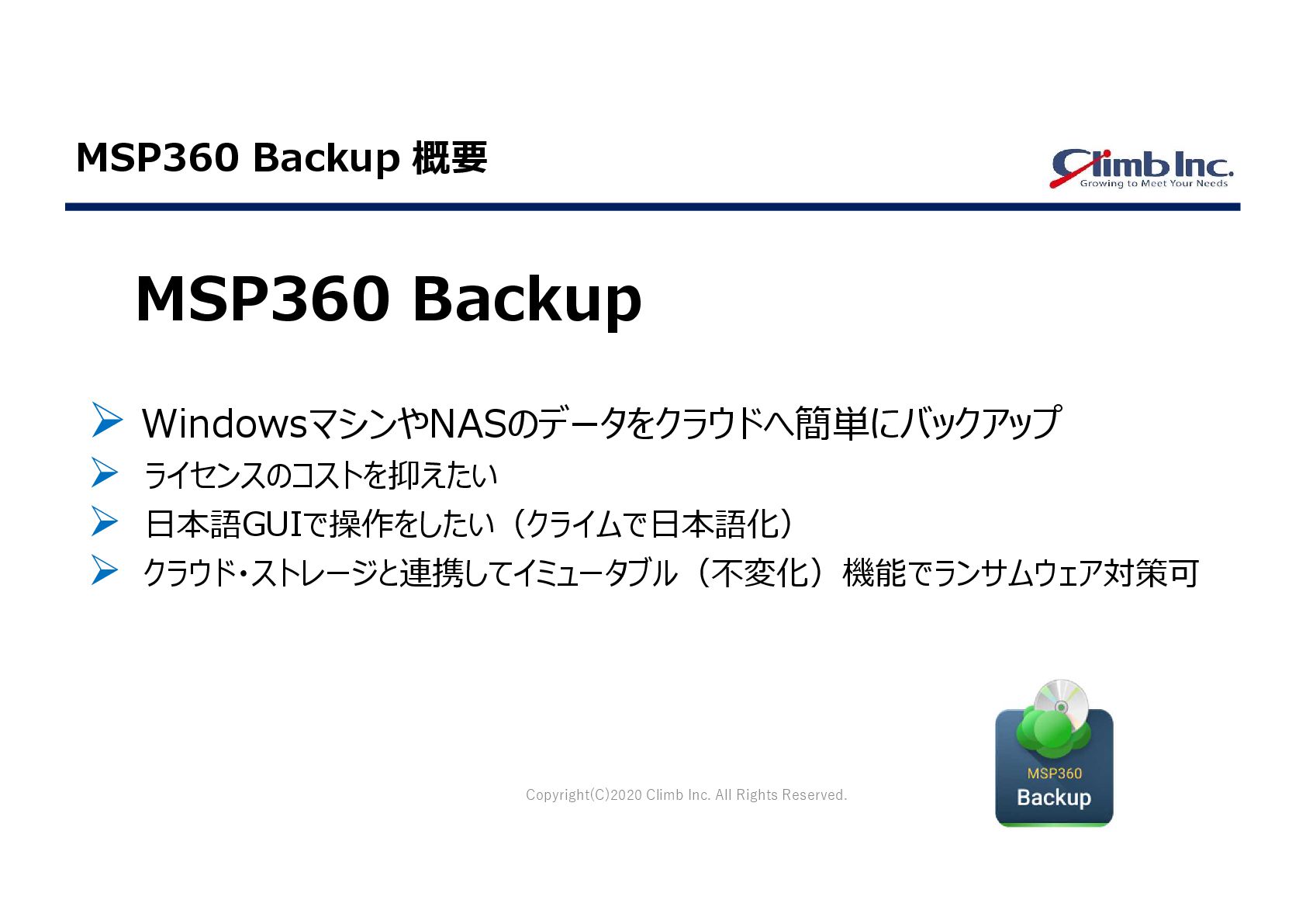 Copyright(C)2020 Climb Inc. All Rights Reserved. MSP360 Backup 概要 MSP360