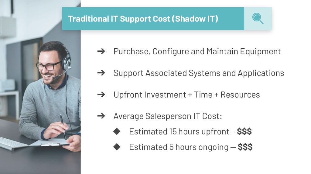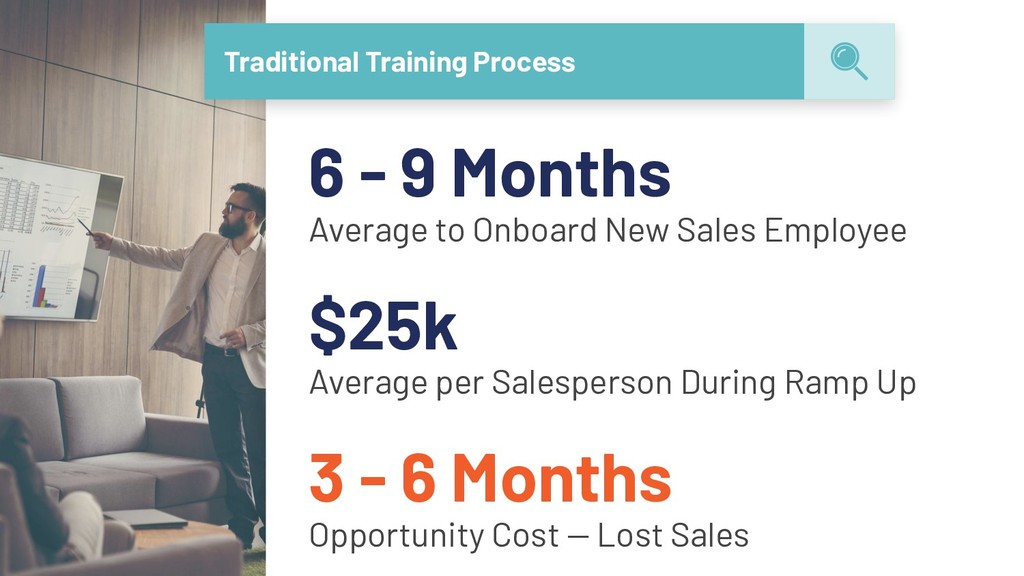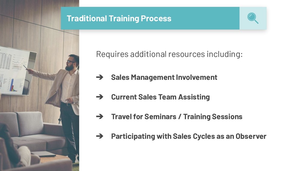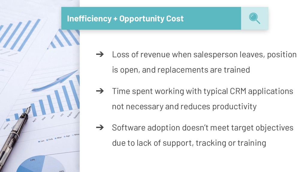 leaves, position is open, and replacements are trained ➔ Time spent working with typical CRM applications not necessary and reduces productivity ➔ Software adoption doesn’t meet target objectives due to lack of support, tracking or training