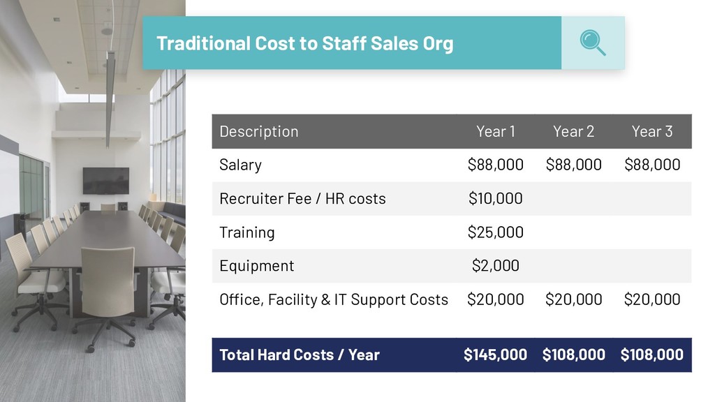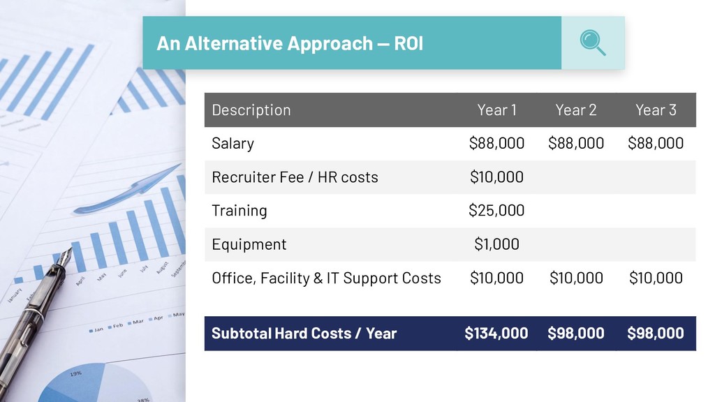 Year 2 Year 3 Salary $88,000 $88,000 $88,000 Recruiter Fee / HR costs $10,000 Training $25,000 Equipment $2,000 Office, Facility & IT Support Costs $20,000 $20,000 $20,000 Subtotal Hard Costs / Year $145,000 $108,000 $108,000