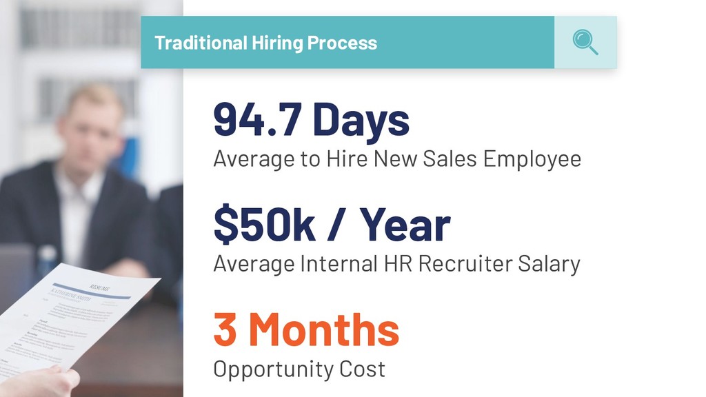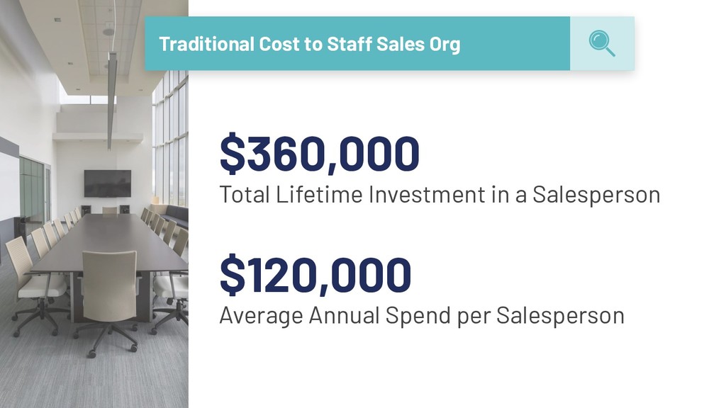 hire, train and provide an office $876k Generated Sales based on 3-5x expected quota $516k / 143% Return on Investment over a period of 3 years (48% YoY) ➔ The model that most companies rely on to operate and justify their continued deployment