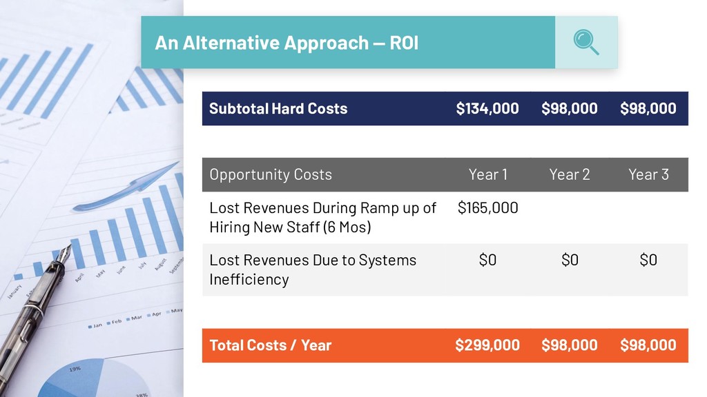 $98,000 Opportunity Costs Year 1 Year 2 Year 3 Lost Revenues During Ramp up of Hiring New Staff (6 Mos) $165,000 Lost Revenues Due to Systems Inefficiency $0 $0 $0 Total Costs / Year $299,000 $98,000 $98,000