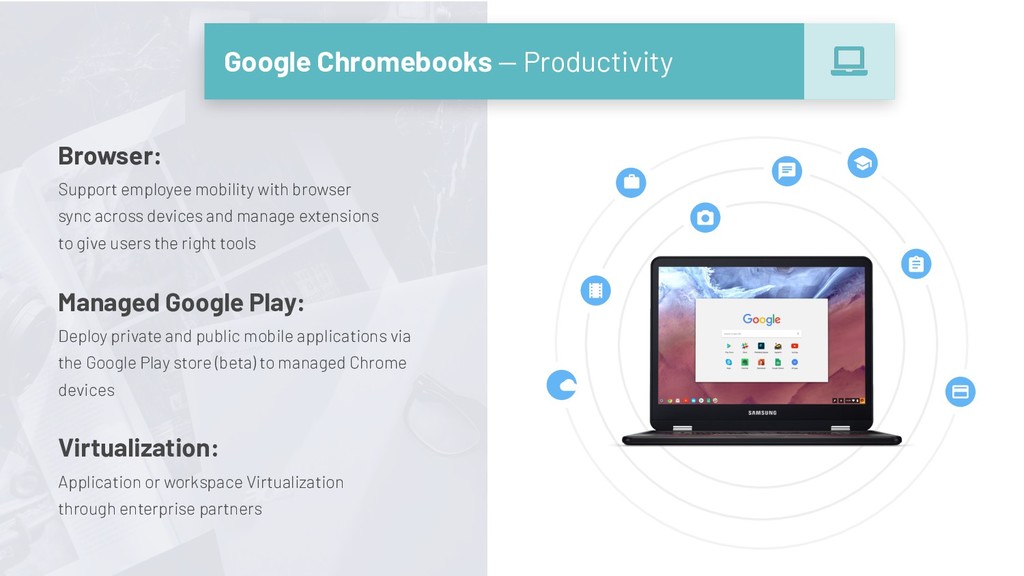 sync across devices and manage extensions to give users the right tools Managed Google Play: Deploy private and public mobile applications via the Google Play store (beta) to managed Chrome devices Virtualization: Application or workspace Virtualization through enterprise partners