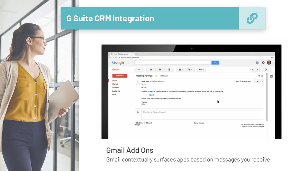 Suite Emails, Calendar, & Docs published to CRM Unified Communications Call automatically logged and captured to CRM CRM Data centrally stored and accurate activity reports Simple Easy Actionable AnalyticsTM