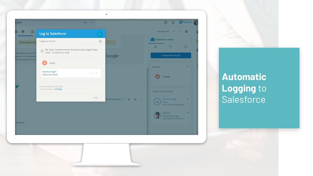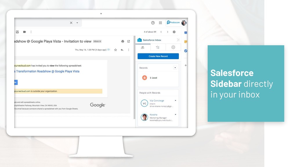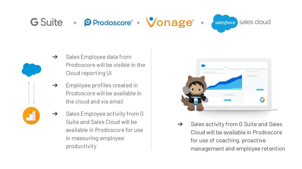 will be available in Prodoscore for use of coaching, proactive management and employee retention ➔ Sales Employee data from Prodoscore will be visible in the Cloud reporting UI ➔ Employee profiles created in Prodoscore will be available in the cloud and via email ➔ Sales Employee activity from G Suite and Sales Cloud will be available in Prodoscore for use in measuring employee productivity + +