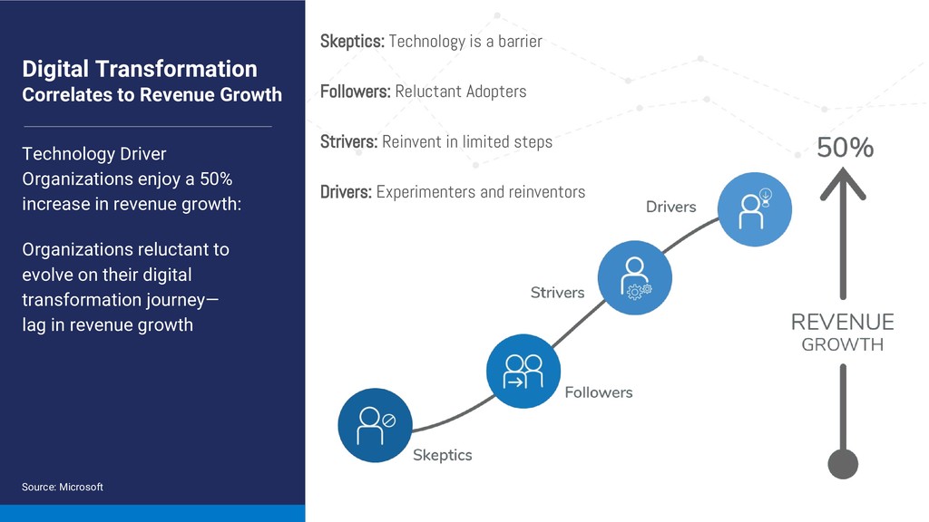 a 50% increase in revenue growth: Organizations reluctant to evolve on their digital transformation journey— lag in revenue growth Skeptics: Technology is a barrier Followers: Reluctant Adopters Strivers: Reinvent in limited steps Drivers: Experimenters and reinventors Source: Microsoft