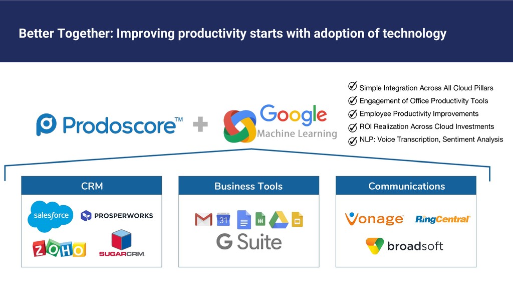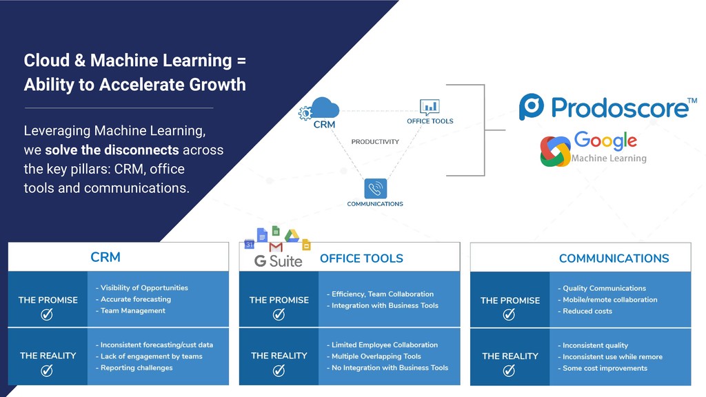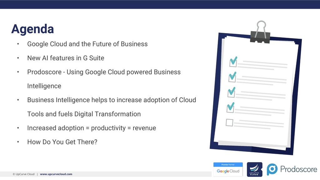 the Future of Business • New AI features in G Suite • Prodoscore - Using Google Cloud powered Business Intelligence • Business Intelligence helps to increase adoption of Cloud Tools and fuels Digital Transformation • Increased adoption = productivity = revenue • How Do You Get There?