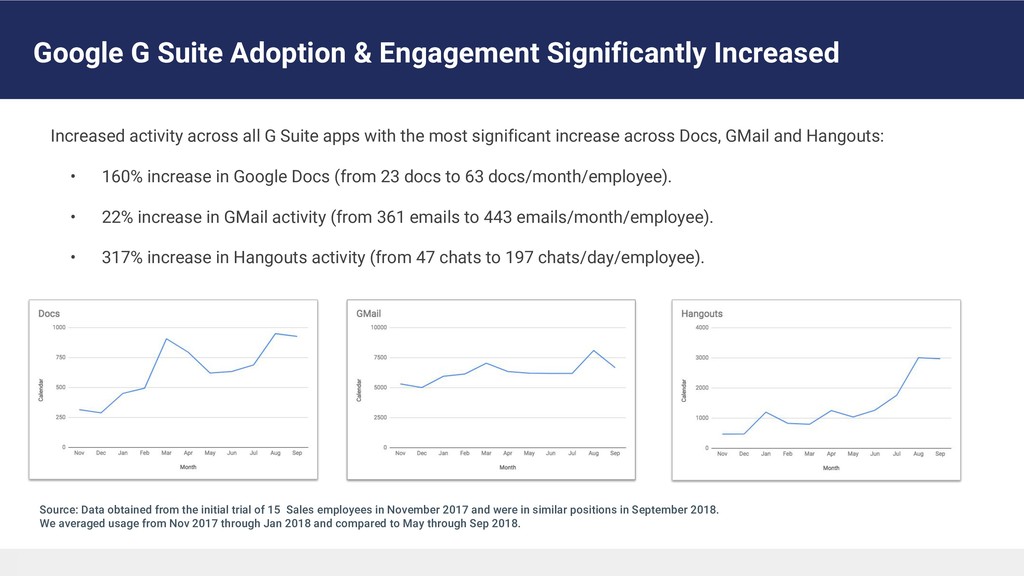 with the most significant increase across Docs, GMail and Hangouts: • 160% increase in Google Docs (from 23 docs to 63 docs/month/employee). • 22% increase in GMail activity (from 361 emails to 443 emails/month/employee). • 317% increase in Hangouts activity (from 47 chats to 197 chats/day/employee). Google G Suite Adoption & Engagement Significantly Increased Source: Data obtained from the initial trial of 15 Sales employees in November 2017 and were in similar positions in September 2018. We averaged usage from Nov 2017 through Jan 2018 and compared to May through Sep 2018.