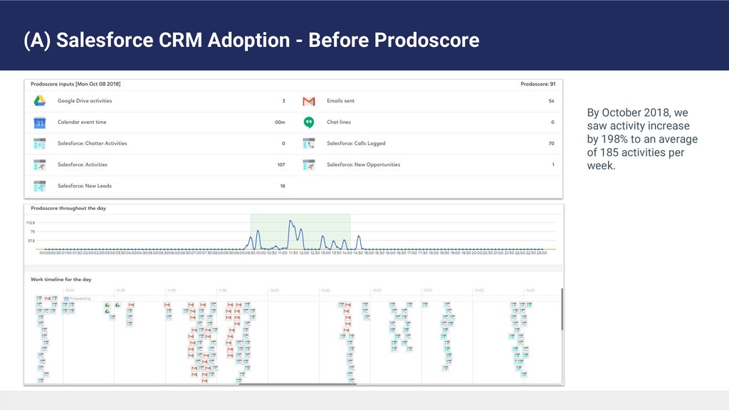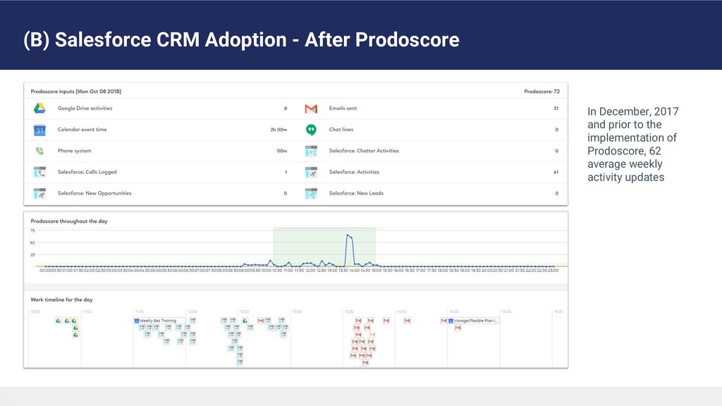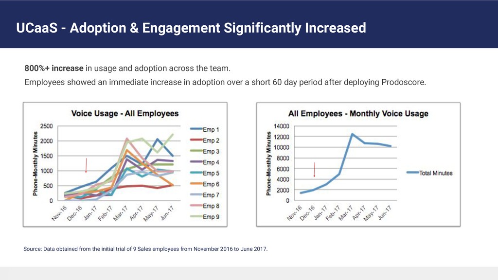 800%+ increase in usage and adoption across the team. Employees showed an immediate increase in adoption over a short 60 day period after deploying Prodoscore. Source: Data obtained from the initial trial of 9 Sales employees from November 2016 to June 2017.