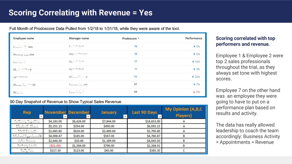 Employee 1 & Employee 2 were top 2 sales professionals throughout the trial, as they always set tone with highest scores. Employee 7 on the other hand was an employee they were going to have to put on a performance plan based on results and activity. The data has really allowed leadership to coach the team accordingly: Business Activity = Appointments = Revenue Full Month of Prodoscore Data Pulled from 1/2/18 to 1/31/18, while they were aware of the tool. 90 Day Snapshot of Revenue to Show Typical Sales Revenue Scoring Correlating with Revenue = Yes