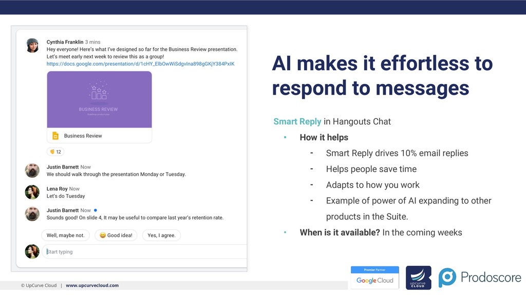 • How it helps ⁃ Smart Reply drives 10% email replies ⁃ Helps people save time ⁃ Adapts to how you work ⁃ Example of power of AI expanding to other products in the Suite. • When is it available? In the coming weeks AI makes it effortless to respond to messages