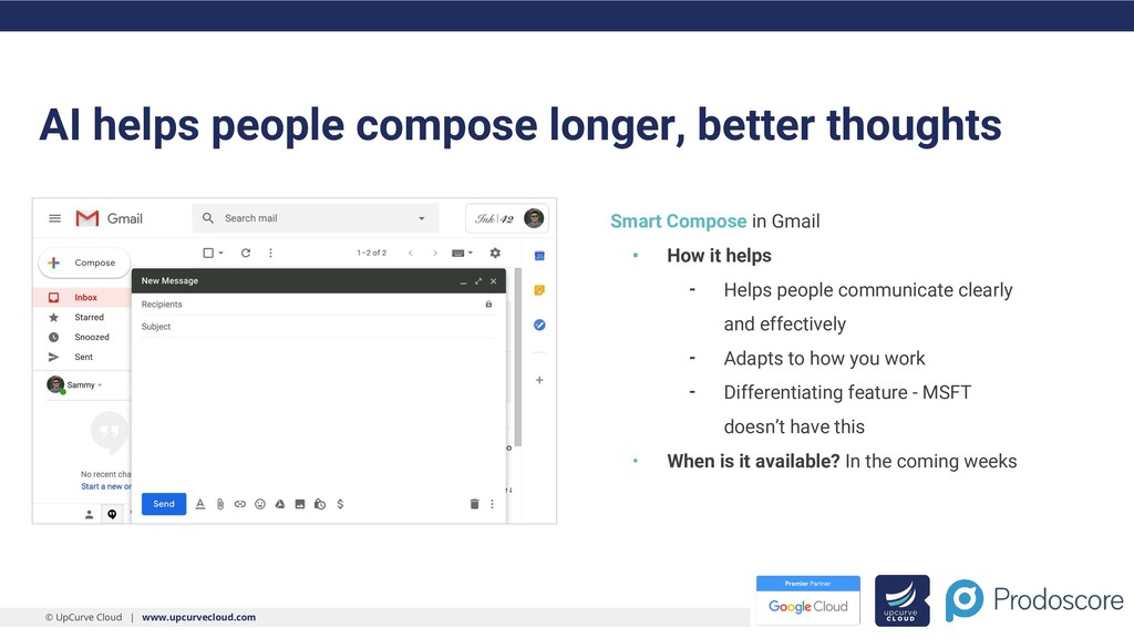 better thoughts Smart Compose in Gmail • How it helps ⁃ Helps people communicate clearly and effectively ⁃ Adapts to how you work ⁃ Differentiating feature - MSFT doesn’t have this • When is it available? In the coming weeks