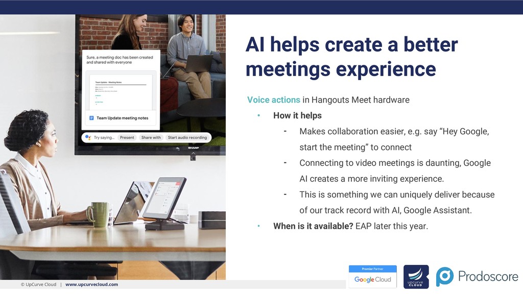 meetings experience Voice actions in Hangouts Meet hardware • How it helps ⁃ Makes collaboration easier, e.g. say “Hey Google, start the meeting” to connect ⁃ Connecting to video meetings is daunting, Google AI creates a more inviting experience. ⁃ This is something we can uniquely deliver because of our track record with AI, Google Assistant. • When is it available? EAP later this year.