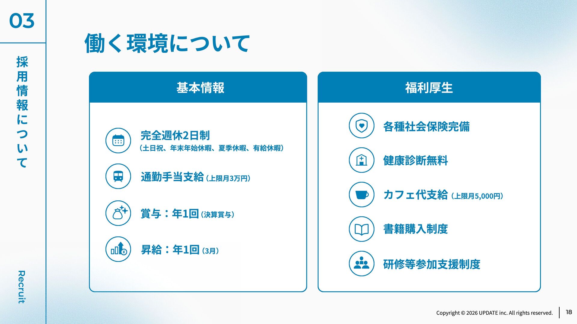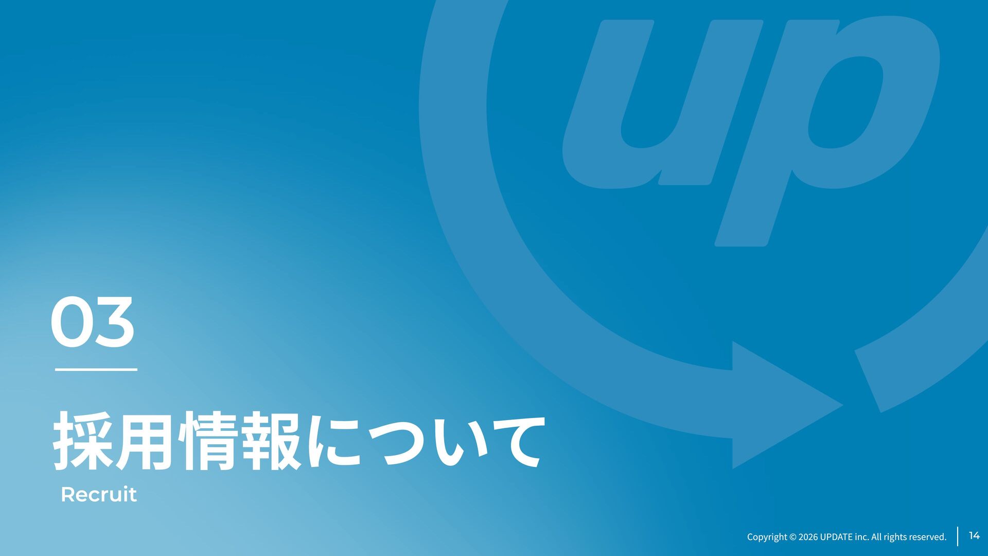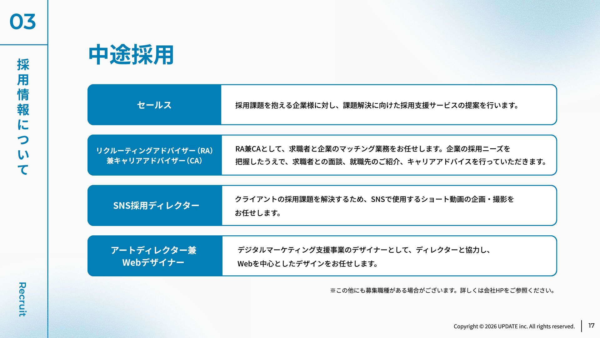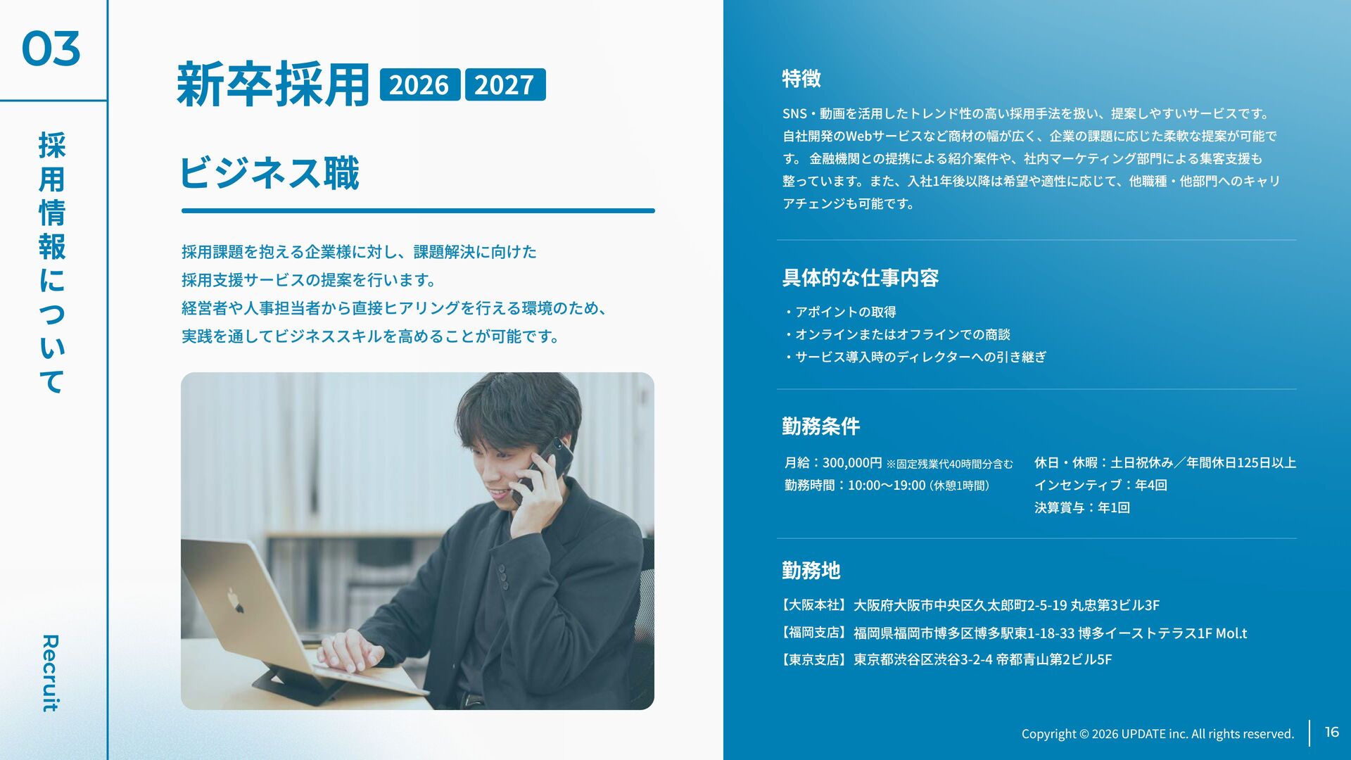 【大阪本社】 【福岡支店】 【東京支店】 大阪府大阪市中央区久太郎町2-5-19 丸忠第3ビル3F 福岡県福岡市博多区博多駅東1-18-33 博多イーストテラス1F Mol.t 東京都渋谷区渋谷3-2-4 帝都青山第2ビル5F 勤務地 ・アポイントの取得 ・オンラインまたはオフラインでの商談 ・サービス導入時のディレクターへの引き継ぎ 具体的な仕事内容 (休憩1時間) 月給:300,000円 勤務時間:10:00~19:00 ※固定残業代40時間分含む 休日・休暇:土日祝休み/年間休日125日以上 インセンティブ:年4回 決算賞与:年1回 勤務条件 新卒採用 16 Copyright © 2026 UPDATE inc. All rights reserved. SNS・動画を活用したトレンド性の高い採用手法を扱い、提案しやすいサービスです。 自社開発のWebサービスなど商材の幅が広く、企業の課題に応じた柔軟な提案が可能で す。 金融機関との提携による紹介案件や、社内マーケティング部門による集客支援も 整っています。また、入社1年後以降は希望や適性に応じて、他職種・他部門へのキャリ アチェンジも可能です。 特徴 採用課題を抱える企業様に対し、課題解決に向けた 採用支援サービスの提案を行います。 経営者や人事担当者から直接ヒアリングを行える環境のため、 実践を通してビジネススキルを高めることが可能です。 ビジネス職 2026 2027