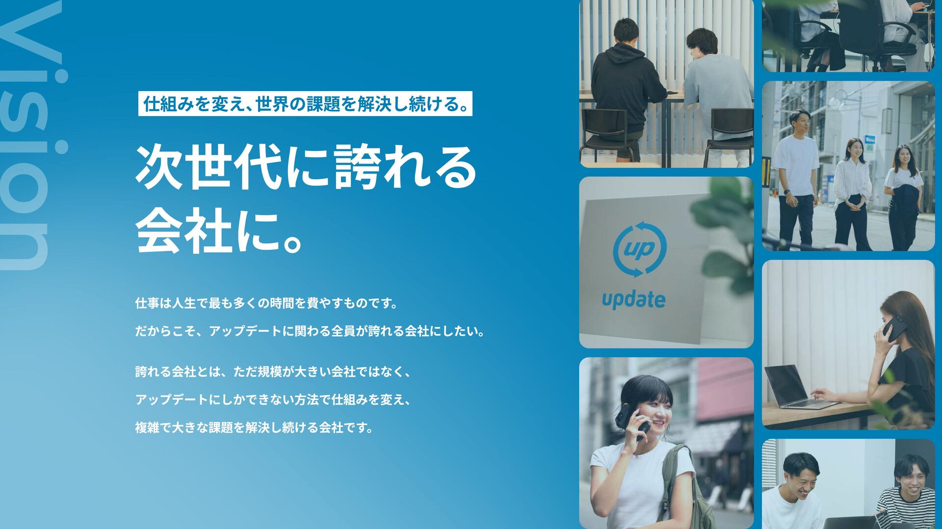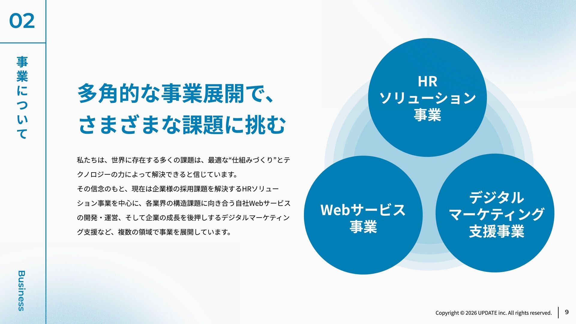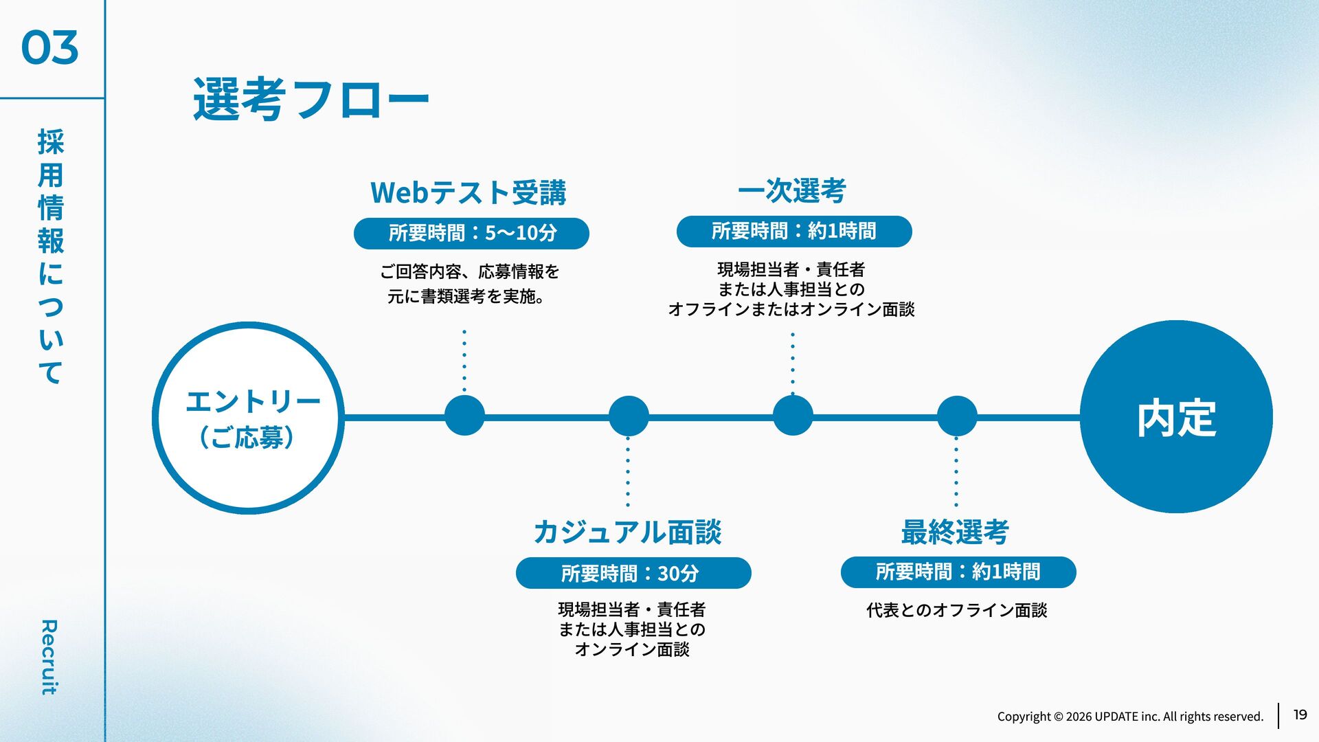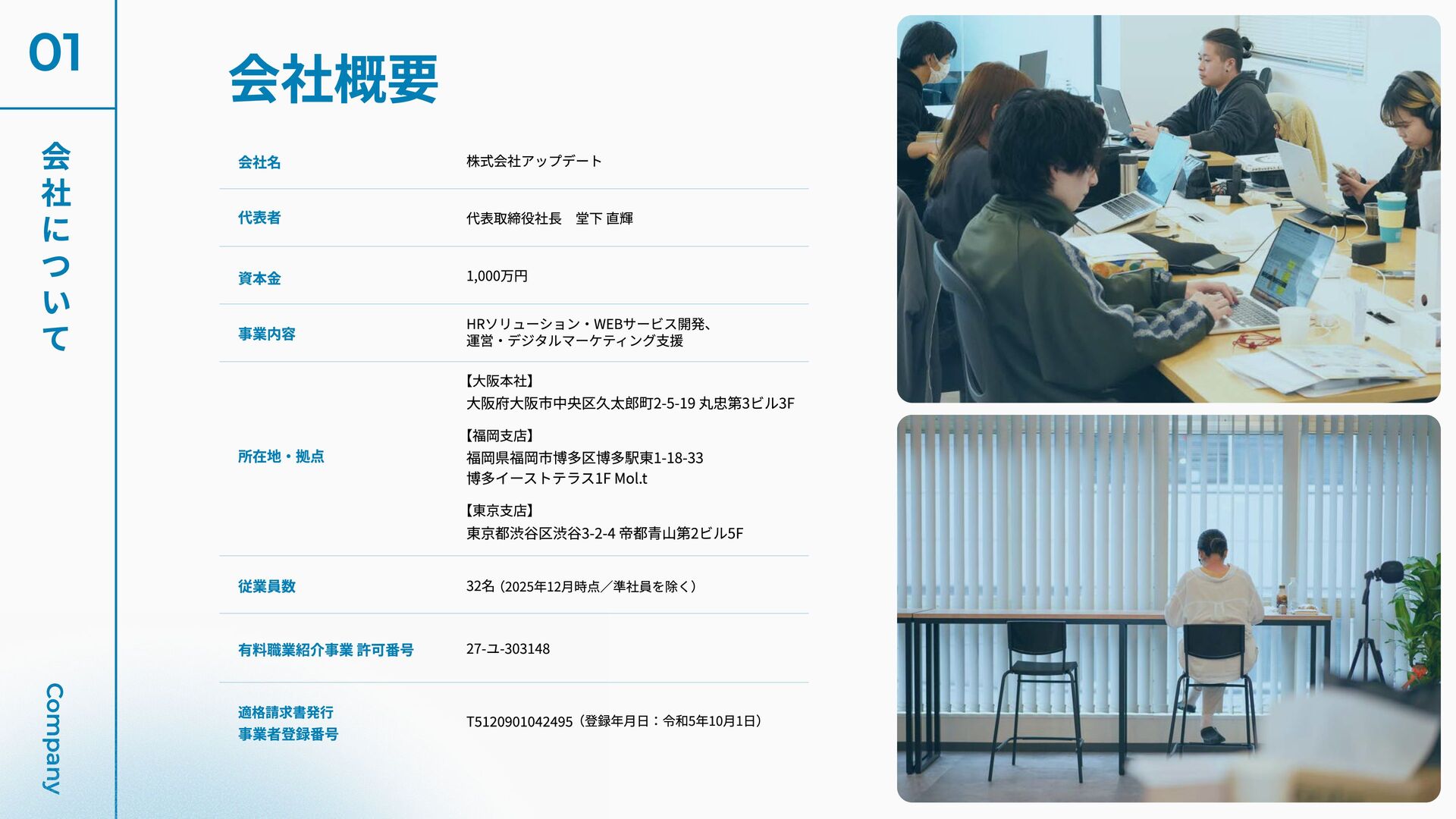 【大阪本社】 【福岡支店】 【東京支店】 大阪府大阪市中央区久太郎町2-5-19 丸忠第3ビル3F 福岡県福岡市博多区博多駅東1-18-33 博多イーストテラス1F Mol.t 東京都渋谷区渋谷3-2-4 帝都青山第2ビル5F 勤務地 ・アポイントの取得 ・オンラインまたはオフラインでの商談 ・サービス導入時のディレクターへの引き継ぎ 具体的な仕事内容 (休憩1時間) 月給:300,000円 勤務時間:10:00~19:00 ※固定残業代40時間分含む 休日・休暇:土日祝休み/年間休日125日以上 インセンティブ:年4回 決算賞与:年1回 勤務条件 新卒採用 16 Copyright © 2026 UPDATE inc. All rights reserved. SNS・動画を活用したトレンド性の高い採用手法を扱い、提案しやすいサービスです。 自社開発のWebサービスなど商材の幅が広く、企業の課題に応じた柔軟な提案が可能で す。 金融機関との提携による紹介案件や、社内マーケティング部門による集客支援も 整っています。また、入社1年後以降は希望や適性に応じて、他職種・他部門へのキャリ アチェンジも可能です。 特徴 採用課題を抱える企業様に対し、課題解決に向けた 採用支援サービスの提案を行います。 経営者や人事担当者から直接ヒアリングを行える環境のため、 実践を通してビジネススキルを高めることが可能です。 ビジネス職 2026 2027