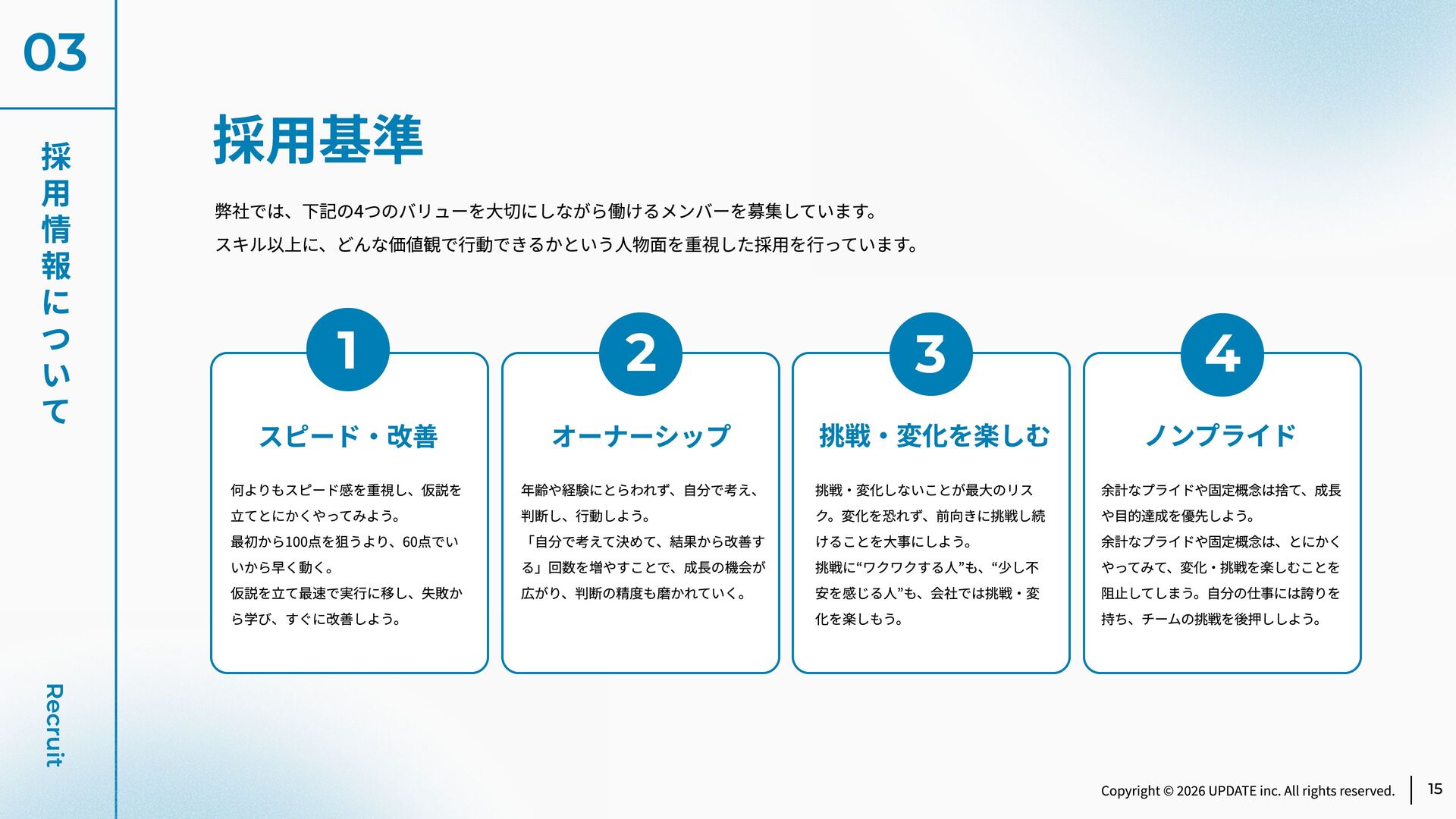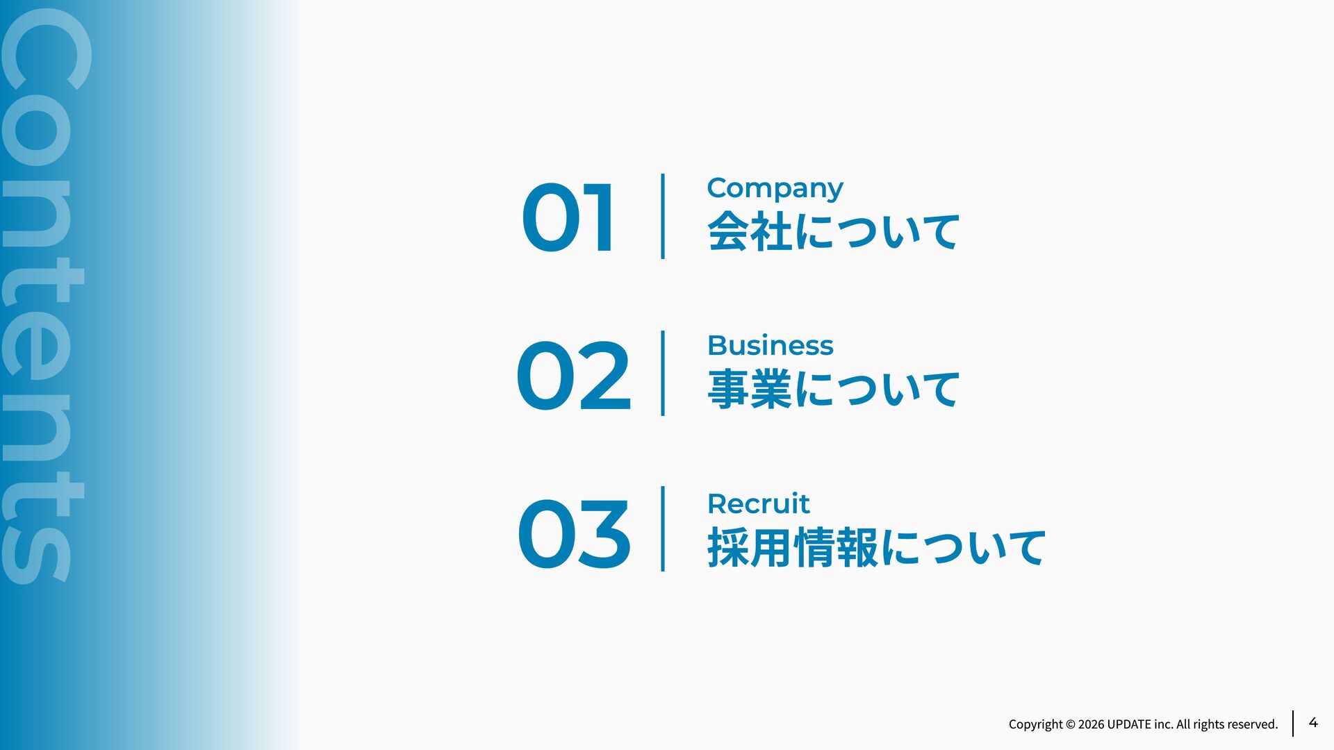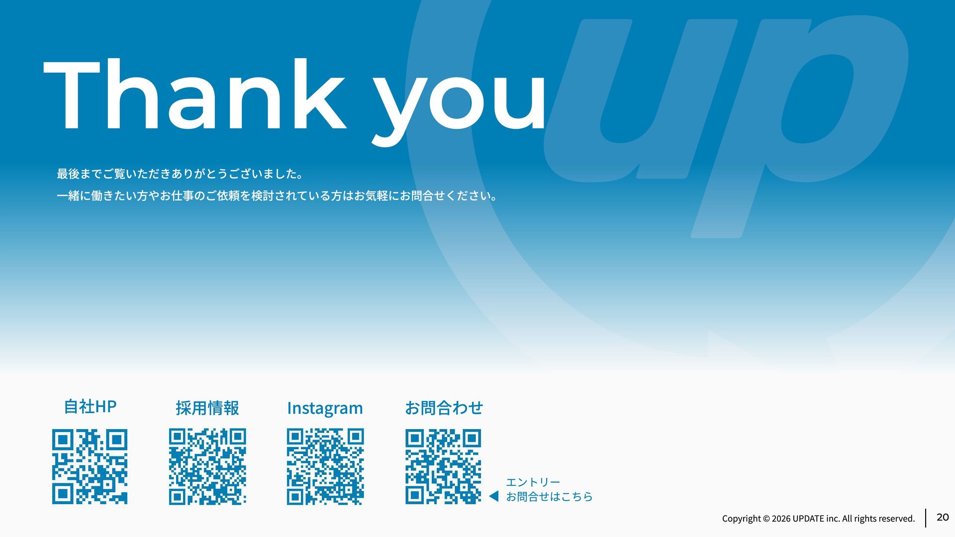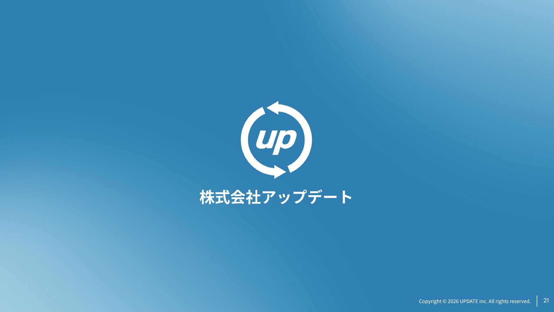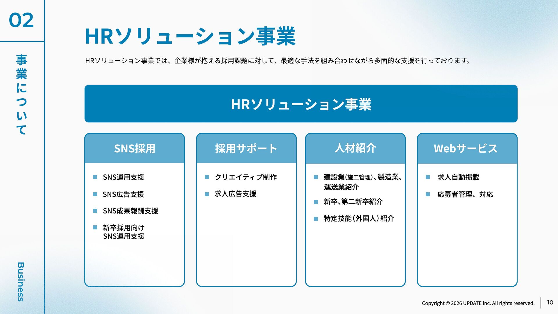 【大阪本社】 【福岡支店】 【東京支店】 大阪府大阪市中央区久太郎町2-5-19 丸忠第3ビル3F 福岡県福岡市博多区博多駅東1-18-33 博多イーストテラス1F Mol.t 東京都渋谷区渋谷3-2-4 帝都青山第2ビル5F 勤務地 ・アポイントの取得 ・オンラインまたはオフラインでの商談 ・サービス導入時のディレクターへの引き継ぎ 具体的な仕事内容 (休憩1時間) 月給:300,000円 勤務時間:10:00~19:00 ※固定残業代40時間分含む 休日・休暇:土日祝休み/年間休日125日以上 インセンティブ:年4回 決算賞与:年1回 勤務条件 新卒採用 16 Copyright © 2026 UPDATE inc. All rights reserved. SNS・動画を活用したトレンド性の高い採用手法を扱い、提案しやすいサービスです。 自社開発のWebサービスなど商材の幅が広く、企業の課題に応じた柔軟な提案が可能で す。 金融機関との提携による紹介案件や、社内マーケティング部門による集客支援も 整っています。また、入社1年後以降は希望や適性に応じて、他職種・他部門へのキャリ アチェンジも可能です。 特徴 採用課題を抱える企業様に対し、課題解決に向けた 採用支援サービスの提案を行います。 経営者や人事担当者から直接ヒアリングを行える環境のため、 実践を通してビジネススキルを高めることが可能です。 ビジネス職 2026 2027
