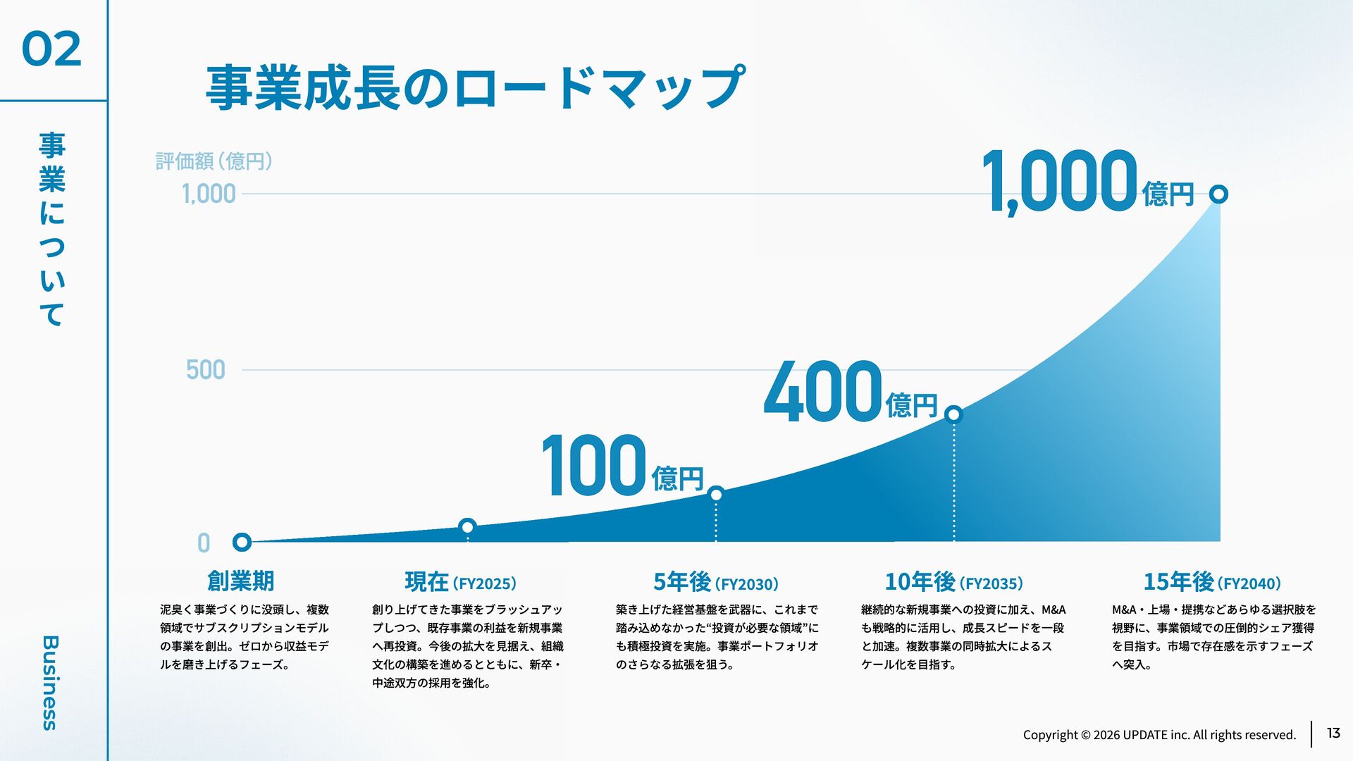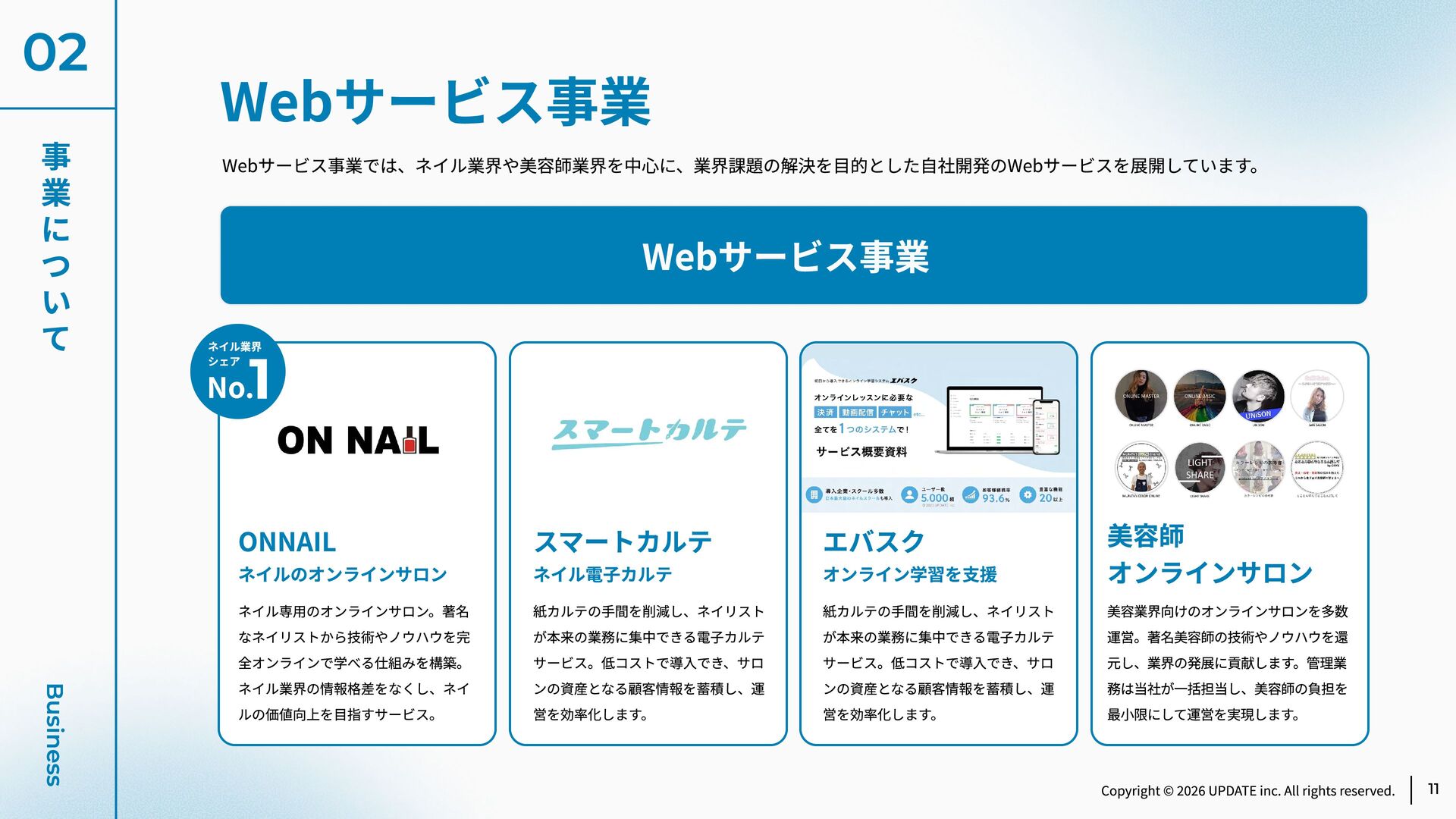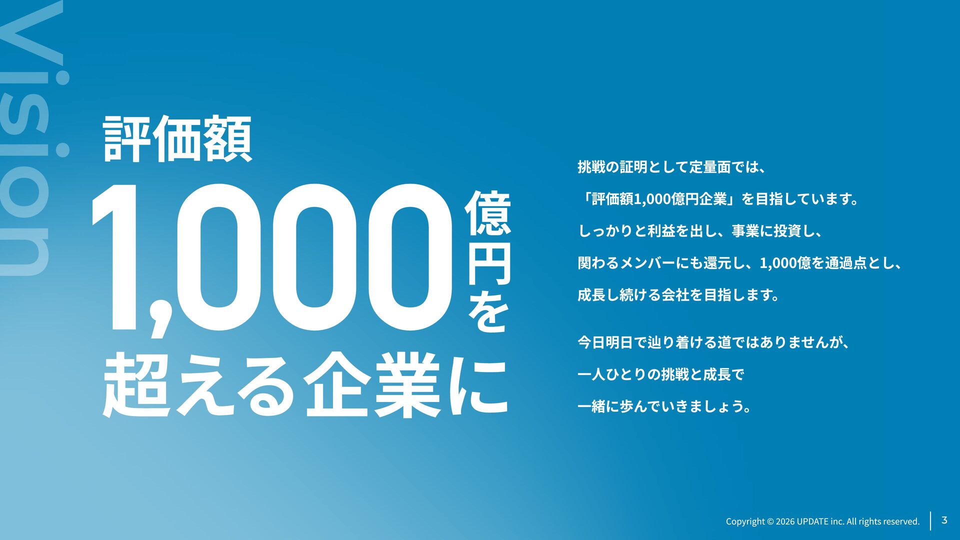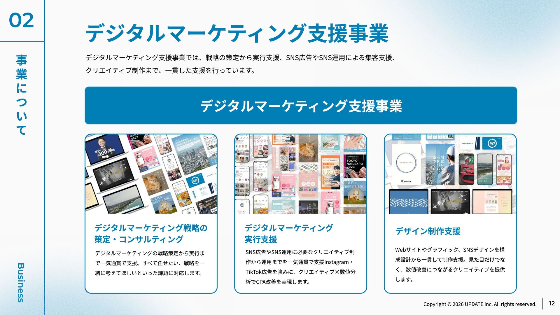 【大阪本社】 【福岡支店】 【東京支店】 大阪府大阪市中央区久太郎町2-5-19 丸忠第3ビル3F 福岡県福岡市博多区博多駅東1-18-33 博多イーストテラス1F Mol.t 東京都渋谷区渋谷3-2-4 帝都青山第2ビル5F 勤務地 ・アポイントの取得 ・オンラインまたはオフラインでの商談 ・サービス導入時のディレクターへの引き継ぎ 具体的な仕事内容 (休憩1時間) 月給:300,000円 勤務時間:10:00~19:00 ※固定残業代40時間分含む 休日・休暇:土日祝休み/年間休日125日以上 インセンティブ:年4回 決算賞与:年1回 勤務条件 新卒採用 16 Copyright © 2026 UPDATE inc. All rights reserved. SNS・動画を活用したトレンド性の高い採用手法を扱い、提案しやすいサービスです。 自社開発のWebサービスなど商材の幅が広く、企業の課題に応じた柔軟な提案が可能で す。 金融機関との提携による紹介案件や、社内マーケティング部門による集客支援も 整っています。また、入社1年後以降は希望や適性に応じて、他職種・他部門へのキャリ アチェンジも可能です。 特徴 採用課題を抱える企業様に対し、課題解決に向けた 採用支援サービスの提案を行います。 経営者や人事担当者から直接ヒアリングを行える環境のため、 実践を通してビジネススキルを高めることが可能です。 ビジネス職 2026 2027
