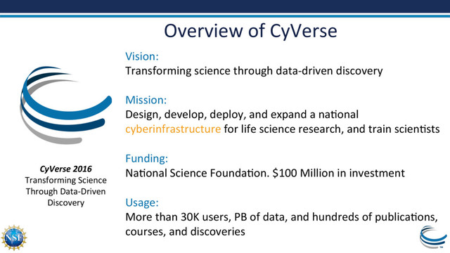 Vision: Transforming science through data-driven discovery Mission: Design, develop, deploy, and expand a naAonal cyberinfrastructure for life science research, and train scienAsts Funding: NaAonal Science FoundaAon. $100 Million in investment Usage: More than 30K users, PB of data, and hundreds of publicaAons, courses, and discoveries