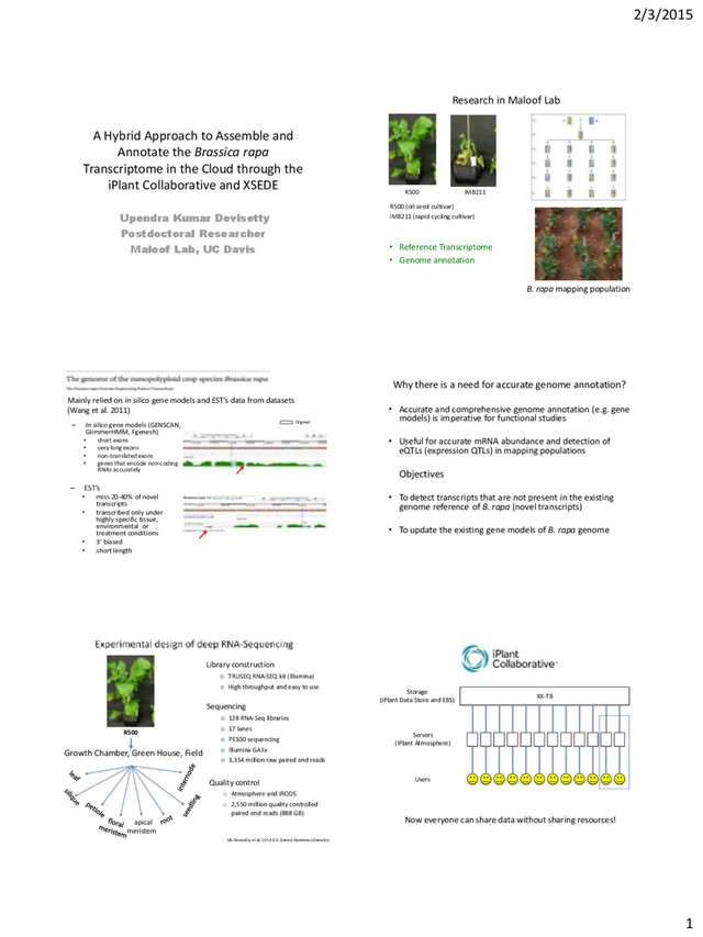 Brassica rapa Transcriptome in the Cloud through the iPlant Collaborative and XSEDE Upendra Kumar Devisetty Postdoctoral Researcher Maloof Lab, UC Davis R500 IMB211 • Reference Transcriptome • Genome annotation R500 (oil seed cultivar) IMB211 (rapid cycling cultivar) B. rapa mapping population Research in Maloof Lab Mainly relied on in silico gene models and EST’s data from datasets (Wang et al. 2011) – In silico gene models (GENSCAN, GlimmerHMM, Fgenesh) • short exons • very long exons • non-translated exons • genes that encode non-coding RNAs accurately – EST’s • miss 20-40% of novel transcripts • transcribed only under highly specific tissue, environmental or treatment conditions • 3’ biased • short length Original Why there is a need for accurate genome annotation? • Accurate and comprehensive genome annotation (e.g. gene models) is imperative for functional studies • Useful for accurate mRNA abundance and detection of eQTLs (expression QTLs) in mapping populations Objectives • To detect transcripts that are not present in the existing genome reference of B. rapa (novel transcripts) • To update the existing gene models of B. rapa genome UK Devisetty et al. 2014 G3: Genes|Genomes|Genetics Growth Chamber, Green House, Field apical meristem R500 Library construction TRUSEQ RNA-SEQ kit (Illumina) High throughput and easy to use Sequencing 128 RNA-Seq libraries 17 lanes PE100 sequencing Illumina GAIIx 3,354 million raw paired end reads Quality control o Atmosphere and iRODS o 2,550 million quality controlled paired end reads (888 GB) Servers (iPlant Atmosphere) XX-TB Storage (iPlant Data Store and EBS) Users Now everyone can share data without sharing resources!