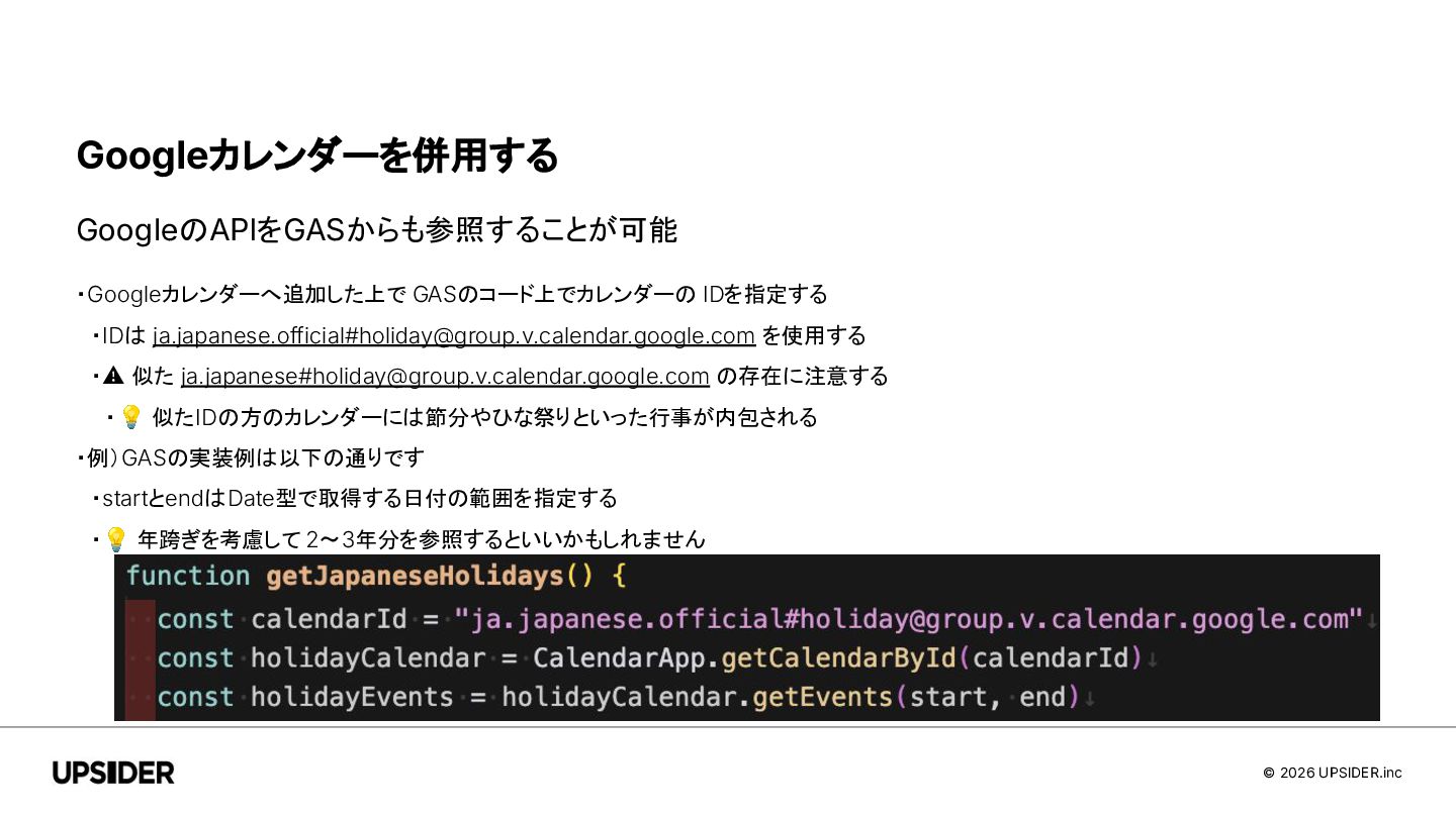 © 2026 UPSIDER.inc Googleカレンダーを併用する GoogleのAPIをGASからも参照することが可能 ・カレンダーに登録されているイベント(祝日)を見る ・日付の曜日を見る 👉 営業日かどうかを判定できる! ・特定の日が営業日ではない場合、その直前の(直後の)営業日を取得したい